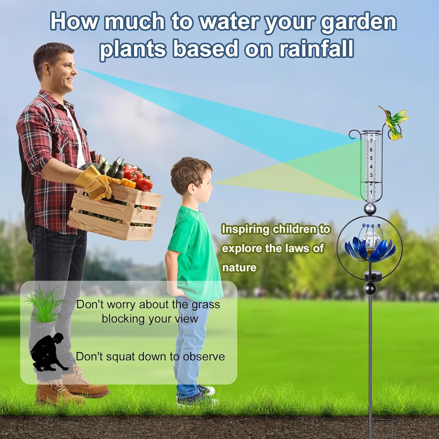 Artistic and Practical: This Lotus wind rotating rain gauge not only observes the amount of rainfall, it can also be used for landscape stake lights for gardens, fences,lawns,patios,yards,flower bed,vegetable garden,rock bed. Solar lotus flower lamp rain gauge This piece seamlessly blends artistic charm with eco-conscious utility, a true marriage of nature’s beauty and intelligent horticultural care.