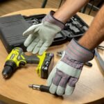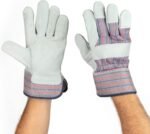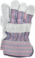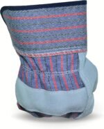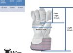 Seamless from thumb to palm Double leather palm for extra protection Extra long rubberized safety cuff 3 and 1/2″