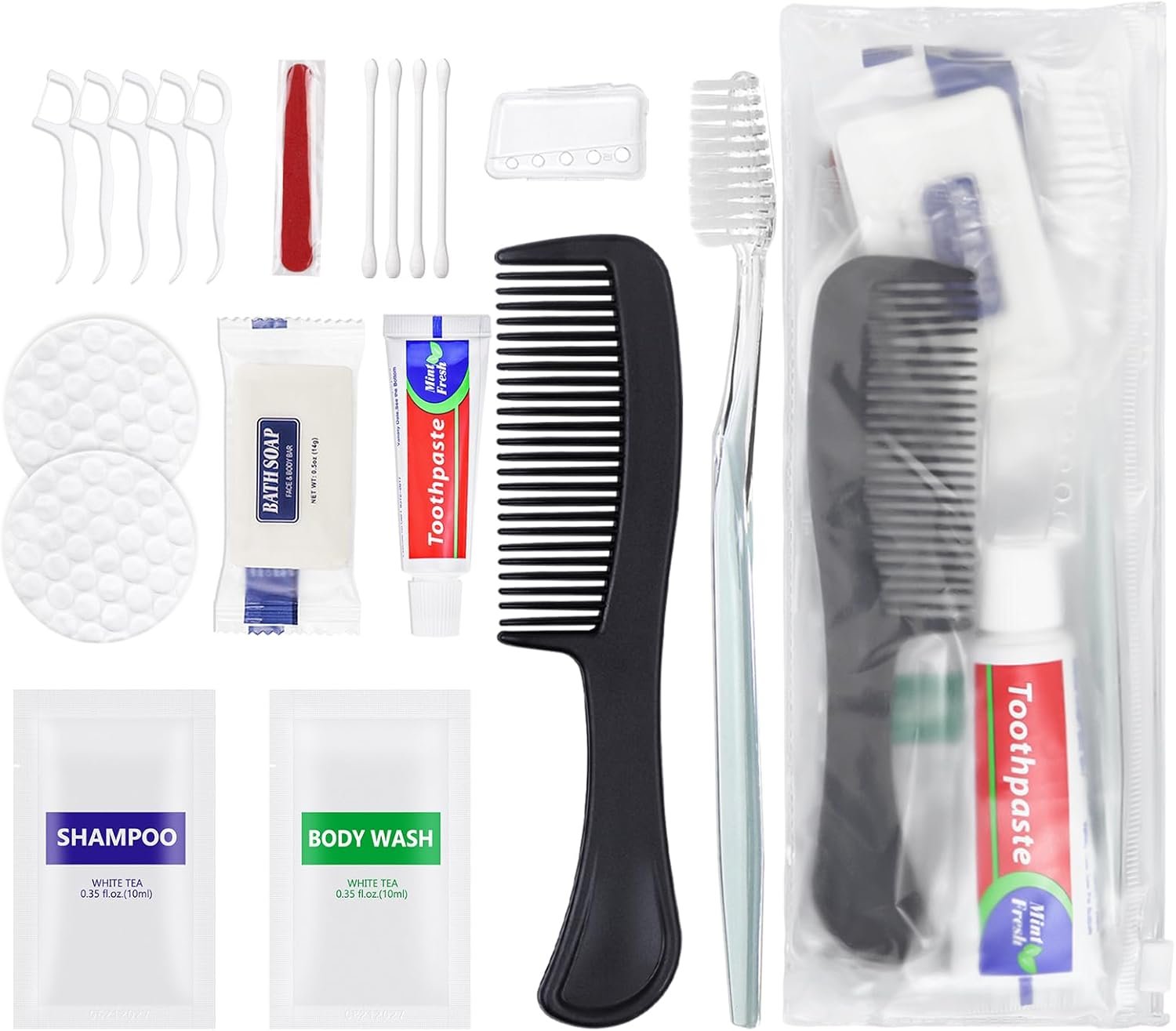 50 Set Comprehensive Hygiene Kits: 10-IN-1 travel toiletry kit. Each package includes 1*soap(14g/0.5oz), 1*toothbrushes, 1*toothpastes(25g/0.88oz), 1*combs and 5*floss picks, 1*Cover, 1* shampoo(0.35 oz/10ml), 1* bodywash(0.35 oz/10ml), 1*Vanity Kit(4*cotton swabs,2*cotton pads,1-nail file). Each kit is packaged in a reusable zipper bag.