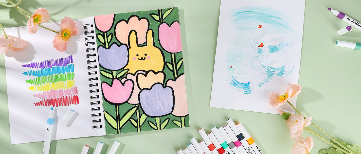 【Spiral Bound Marker Paper Sketchbook】Marker Paper Sketchbook features tear line technology – no scissors required to change pages in seconds. 360° spiral binding allows 180° flat use for seamless edge-to-edge drawing. Portable design fits in an art tote, perfect for park sketching or coffee shop creations