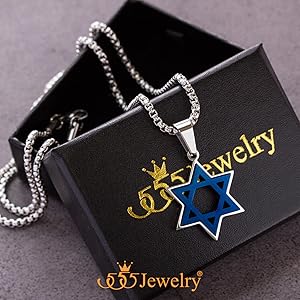 Exclusive design star of david necklace for men, women, designed with a contrasting finish of mirror polish and brushed textures. Available in 5 color combos and complimented with an attractive box chain in a wide range of sizes