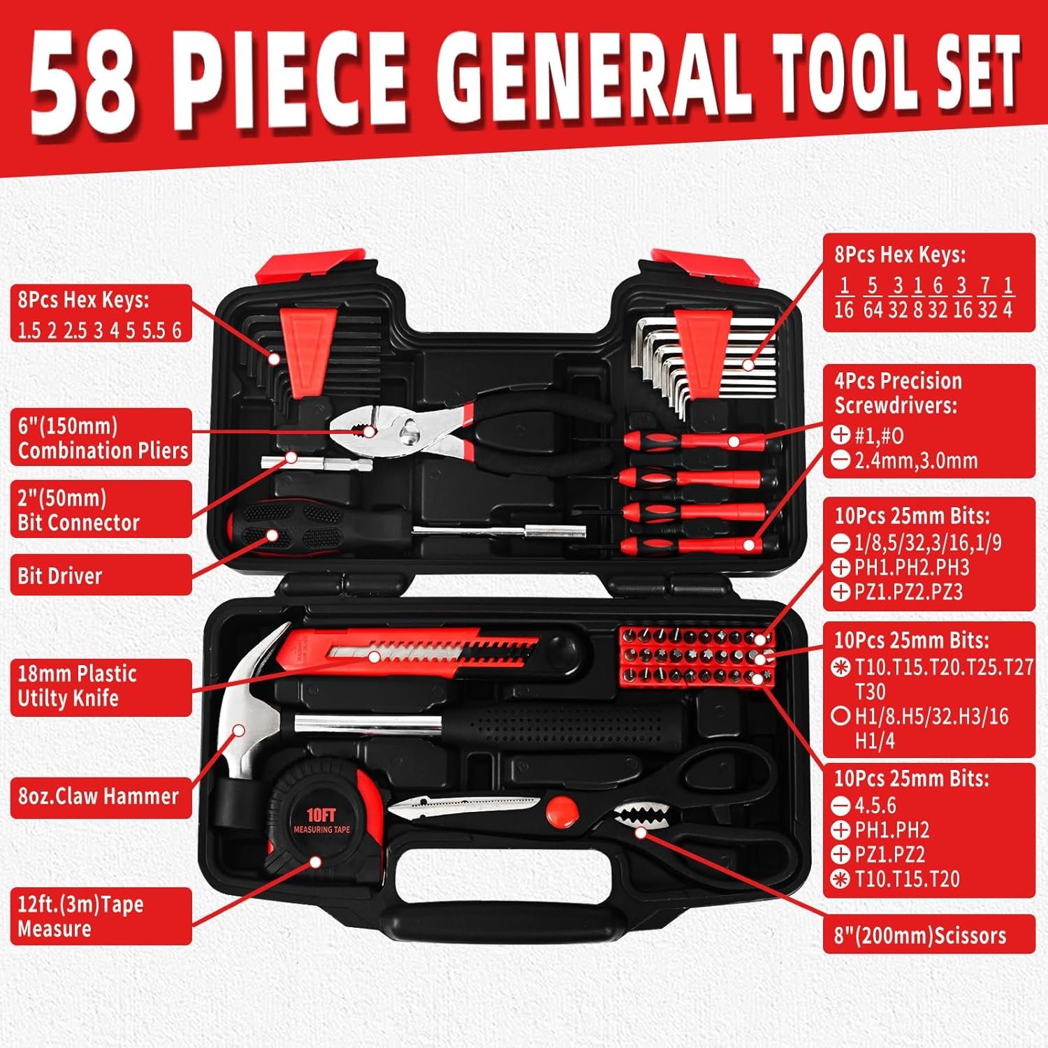 SMALL TOOL KIT: This 58 piece home Tool Set is an essential tool set for daily home project and maintenance like furniture assembly, picture hanging and general purpose repairs, apartment, dorm room, or garage and automotive needs