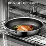 【Compatible with All Stoves】The Stainless Steel Frying Pan has 430 high magnetic conductive stainless steel base, works well on induction stove top, gas stove top, electric cooktop, glass stove, ceramic stove. Dishwasher safe and Oven safe up to 480°F