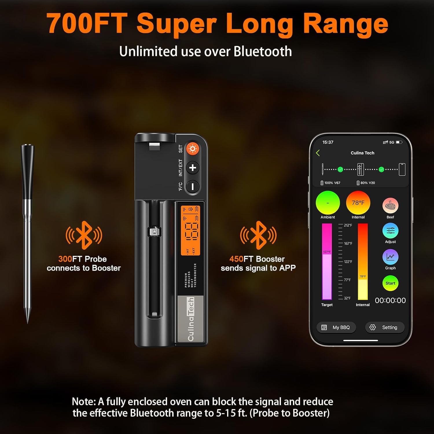 【700ft Long Range】- Probe to Booster: 300ft for open equipments, 6.6~33ft (2-10m) for enclosed equipments (The enclosed equipments shield signals resulting in shorter connection distances within 33ft/10m); Booster to Smart Phone: 450ft