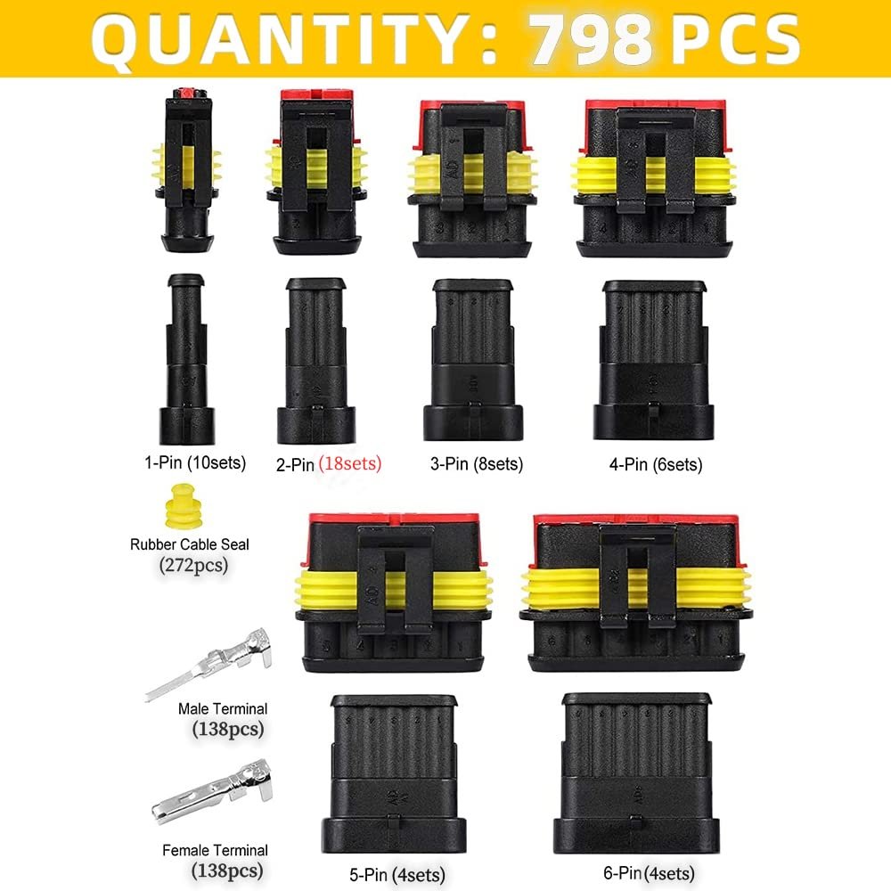 Package Included: (798pcs/50kit) 1/2/3/4/5/6 Pin 22-16 AWG super sealed automotive electrical wire connector plug kit with male & female terminal and silicone rubber cable seal. A total of 50 sets of wire harness connectors are included, which can meet most of your needs.