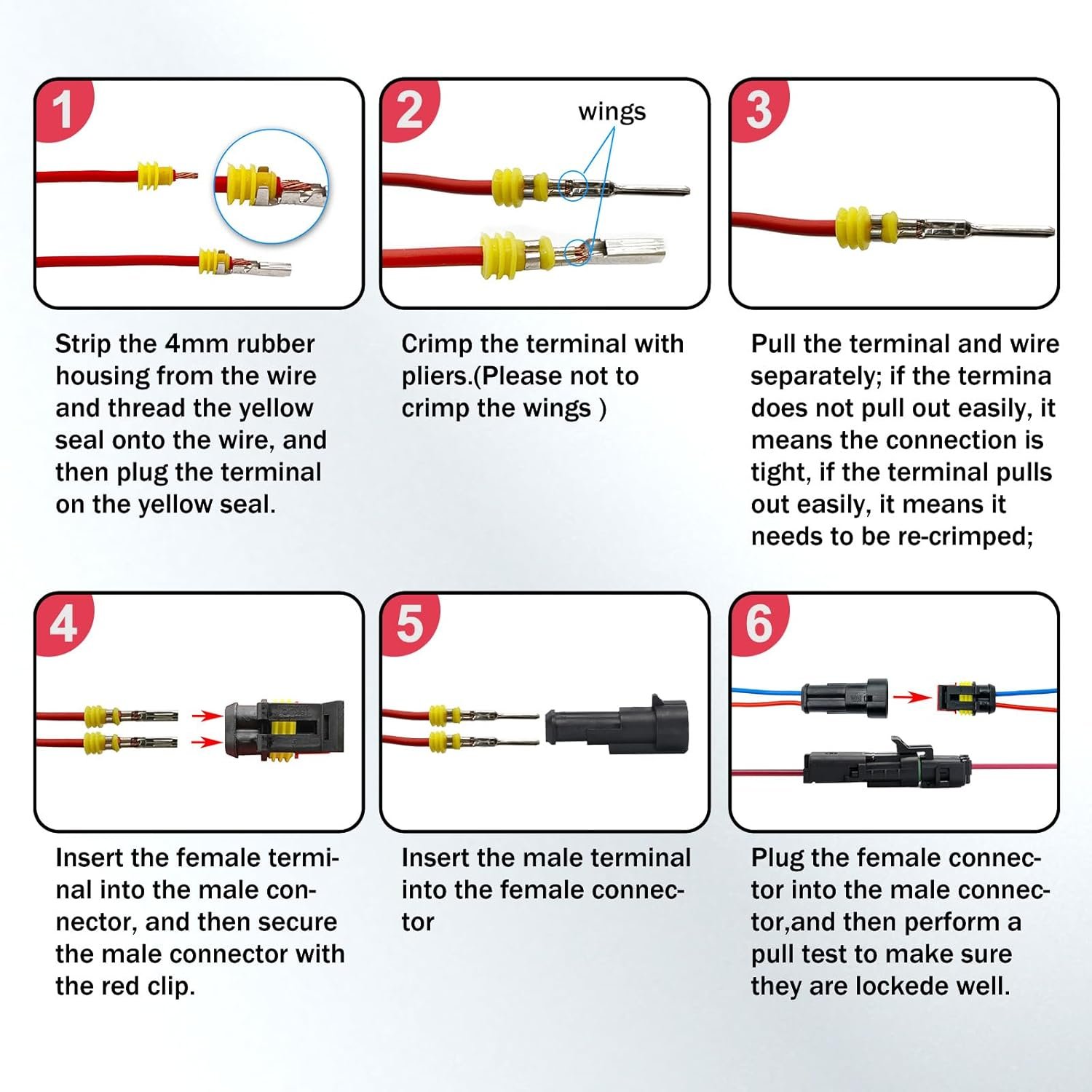 Easy to Install: The buckle design ensures accurate and complete insertion of the contact in the housing and prevents it from slipping out of the wire connectors, easy to install under soldering and crimping, reliable safe connection, no loose, and lightweight. They are perfect automotive replacement ignition plug connectors.