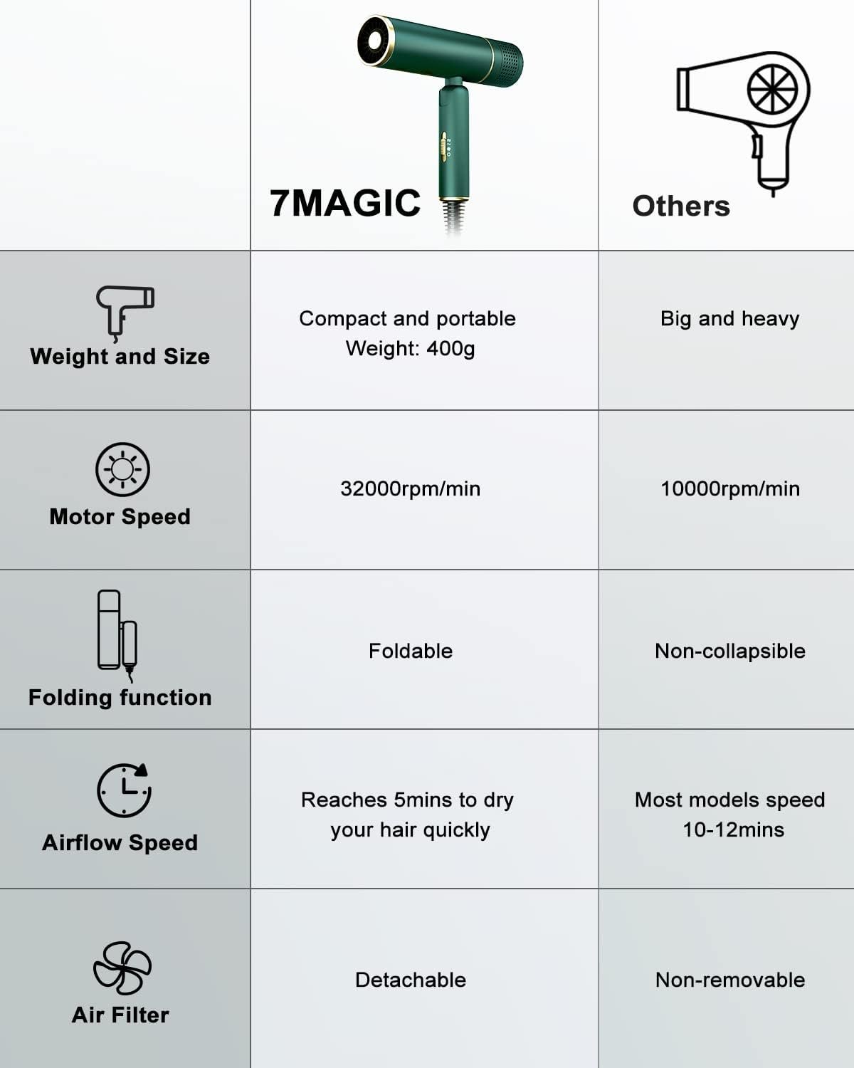 Blowing Hair Time 30% Faster than Ordinary Hair Dryer – 7MAGIC hair dryer’s wind speed is 2 times the other hairdryer; the maximum wind speed is 18m/s; the rotational speed is 32000 RPM. Drying hair is 30% faster than the ordinary hair dryer. It only takes 1-2 minutes for short hair, 3-5 minutes for medium-length hair, and 5-8 minutes for thick and long hair