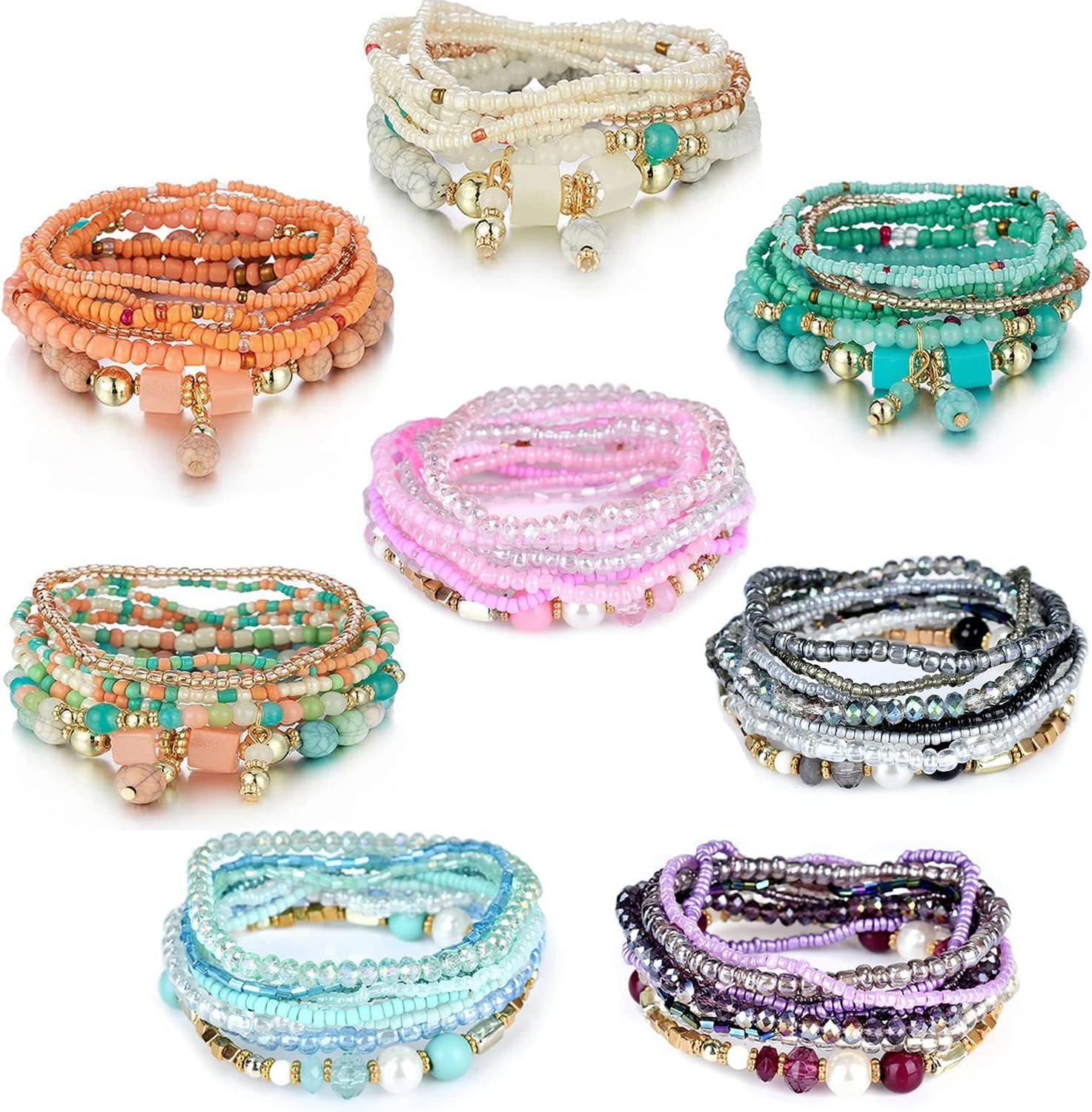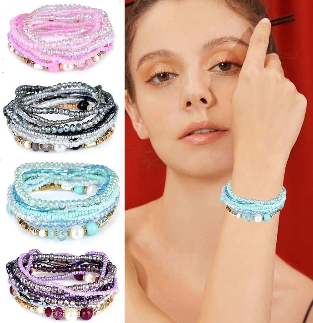8 Sets Bohemian Stackable Bead Bracelets for Women Bohemian Bracelets Stretch Multi Layered beads Bracelet Set Boho Multicolor Jewelry