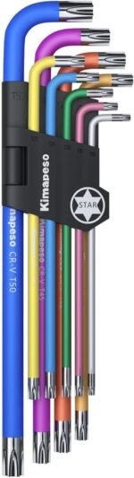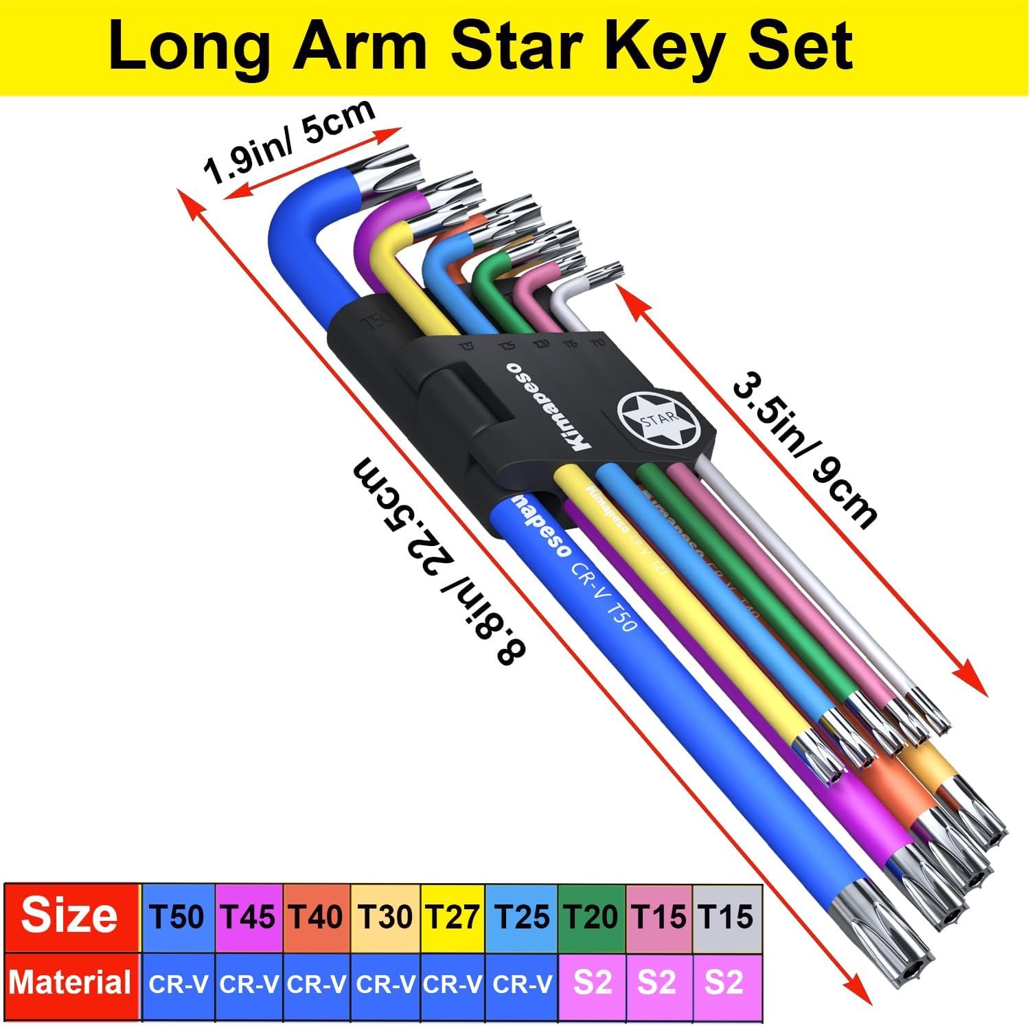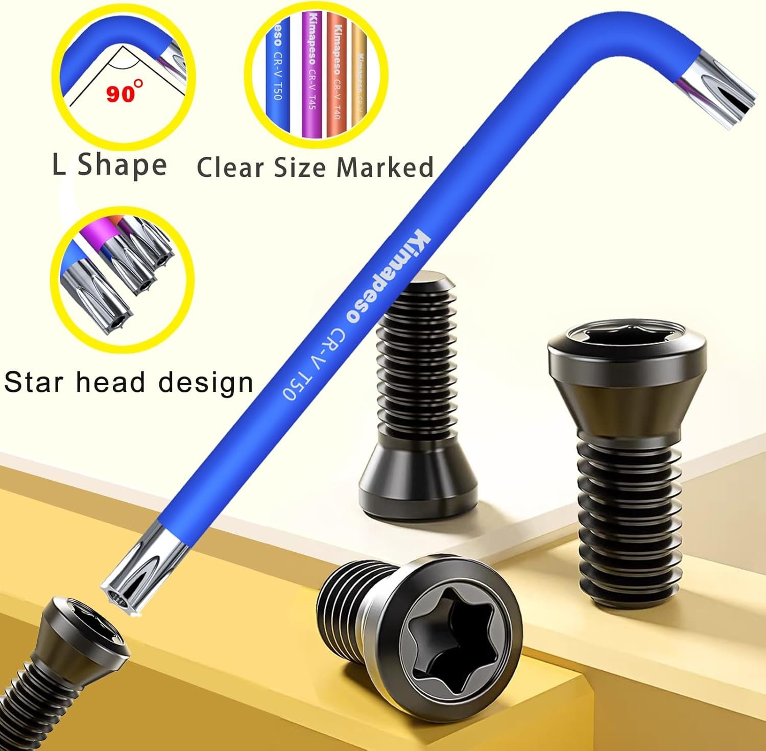 Sizes of Kimapeso Torx Wrench: This star key set includes T10, T15, T20, T25, T27, T30, T40, T45, and T50. The ball end design allows a 25-degree entry angle for flexibility and ease in tight spaces.