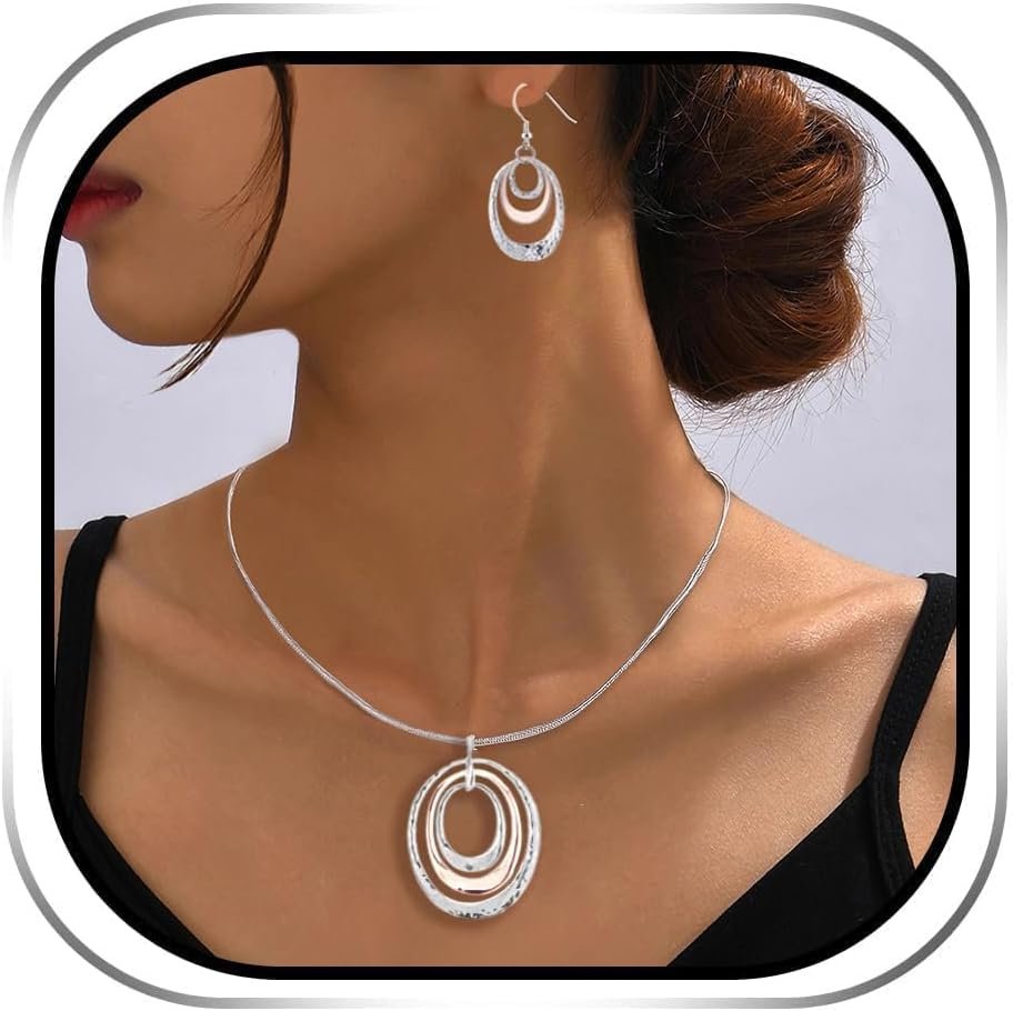 Bohemian Two-Tone Oval Hoop Earrings and Necklace Set Trendy Silver Jewelry Set for Women