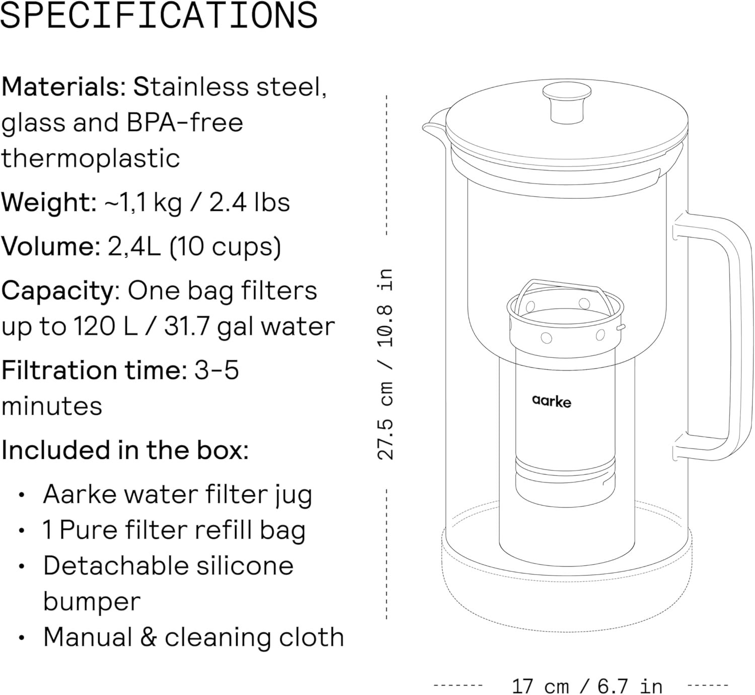 Complete Set: Includes 1 glass water carafe purifier, 1 stainless steel BPA-free cartridge and lid, 1 detachable food grade silicone bumper, 1 pure filter refill bag, product manual, and cleaning cloth for convenience