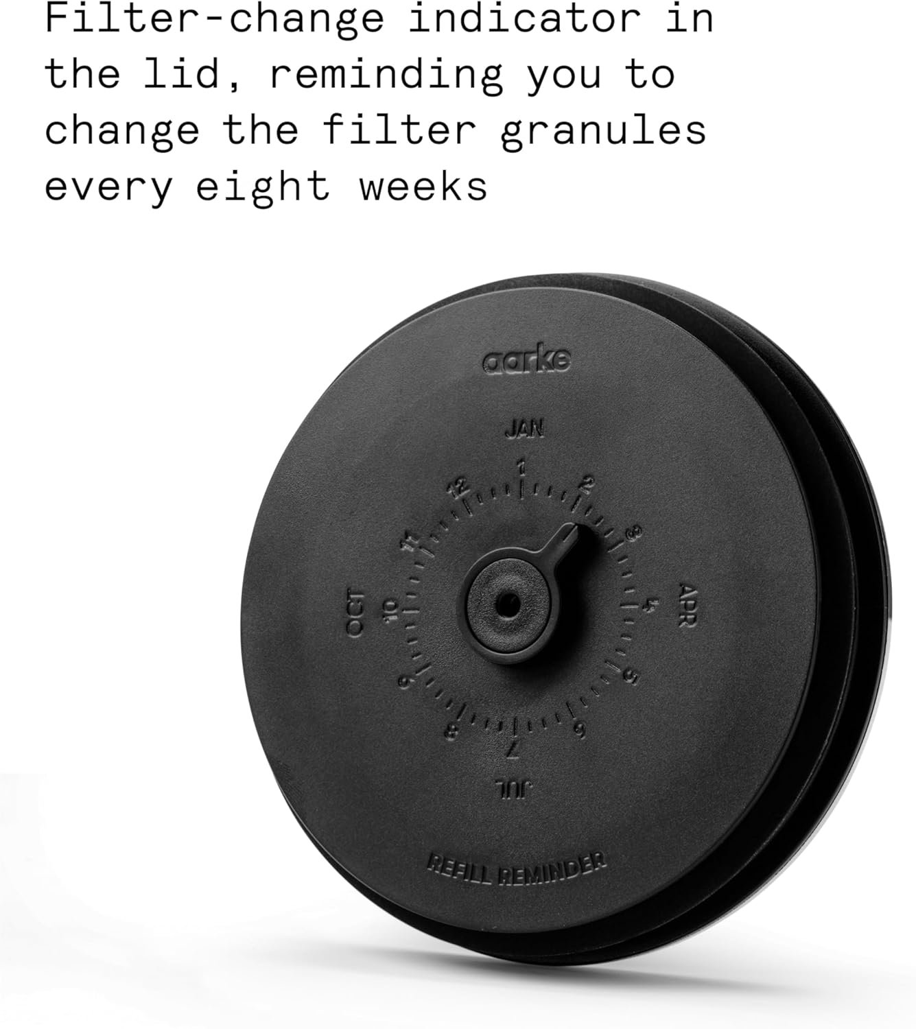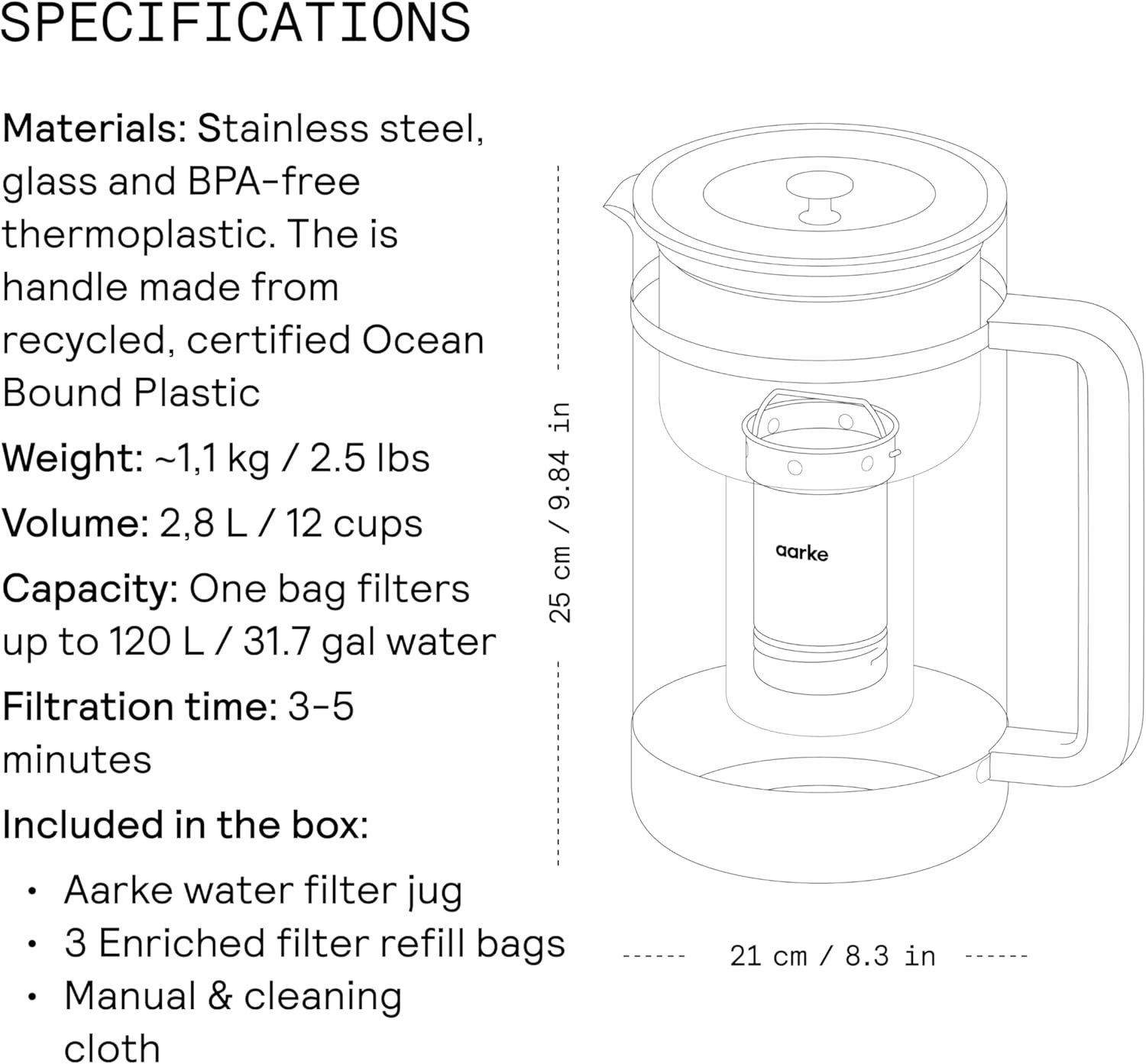 aarke Purifier Large – 1.66 L Glass Water Filter Pitcher Bundle, Refillable Stainless Steel Filter, BPA-Free, Includes (3-Pack) Refill Enriched Granules, Reduce Heavy Metals and Adds Minerals