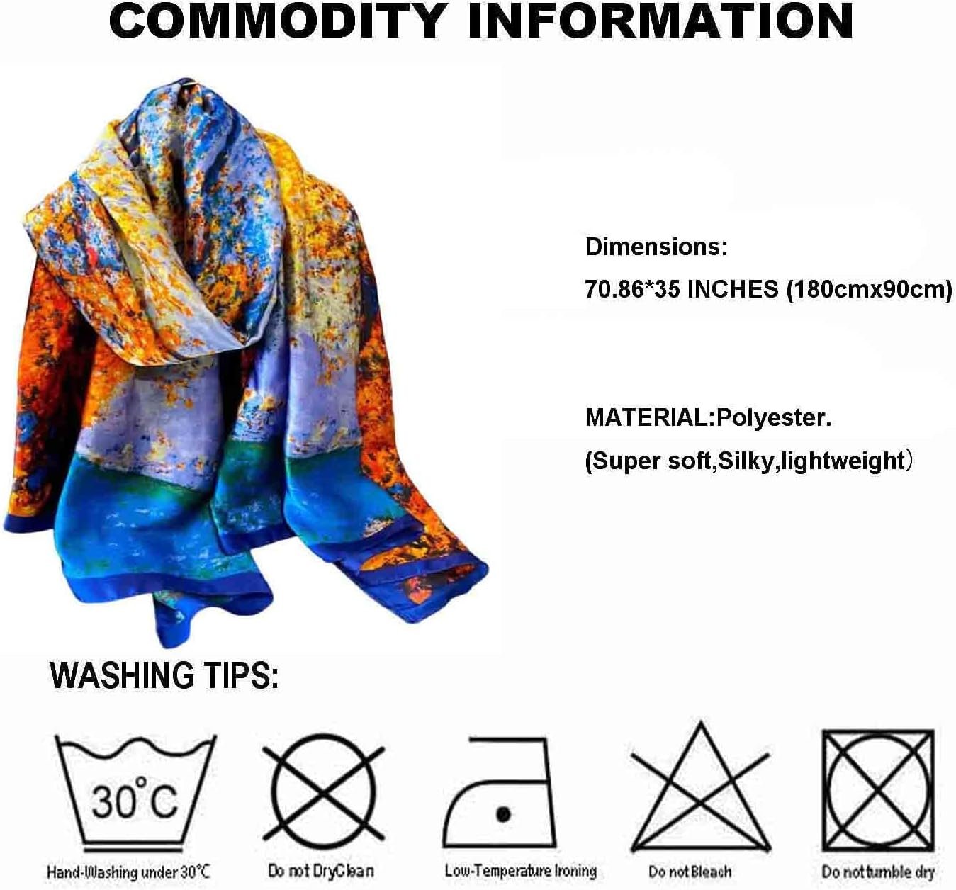 A:This scarf is made of polyester,silk feeling scarf,soft and comfortable to wear, durable and lightweight,