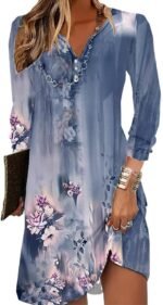 Akivide Women’s Long Sleeve Boho Floral Printed Button Dress Casual Ethnic V-Neck Knee Length Fall Dresses for Women 2023