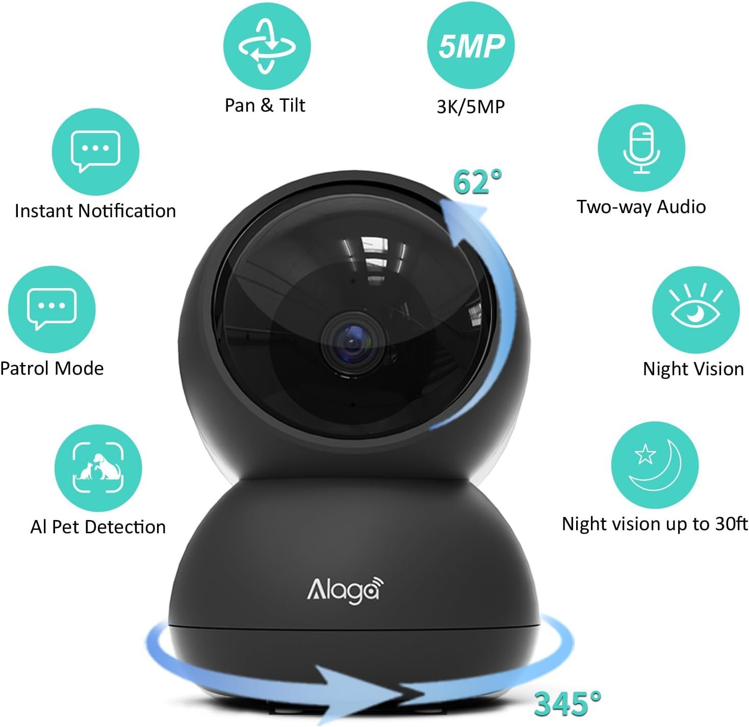 Alaga Indoor Security Camera,3K, 360° Pan/Tilt, Pet/Motion AI, Night Vision, Speaker, Indoor Camera with Phone App, Compatible with Alexa & Google Assistant,5G & 2.4GHz WiFi,Black