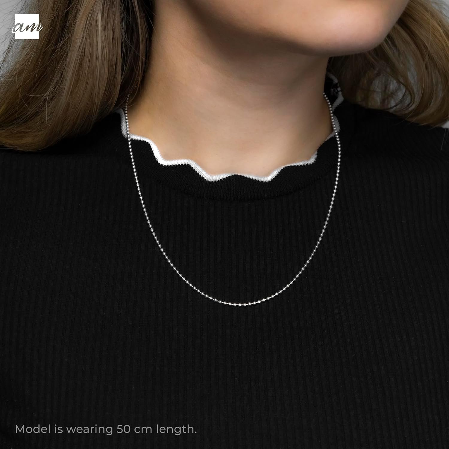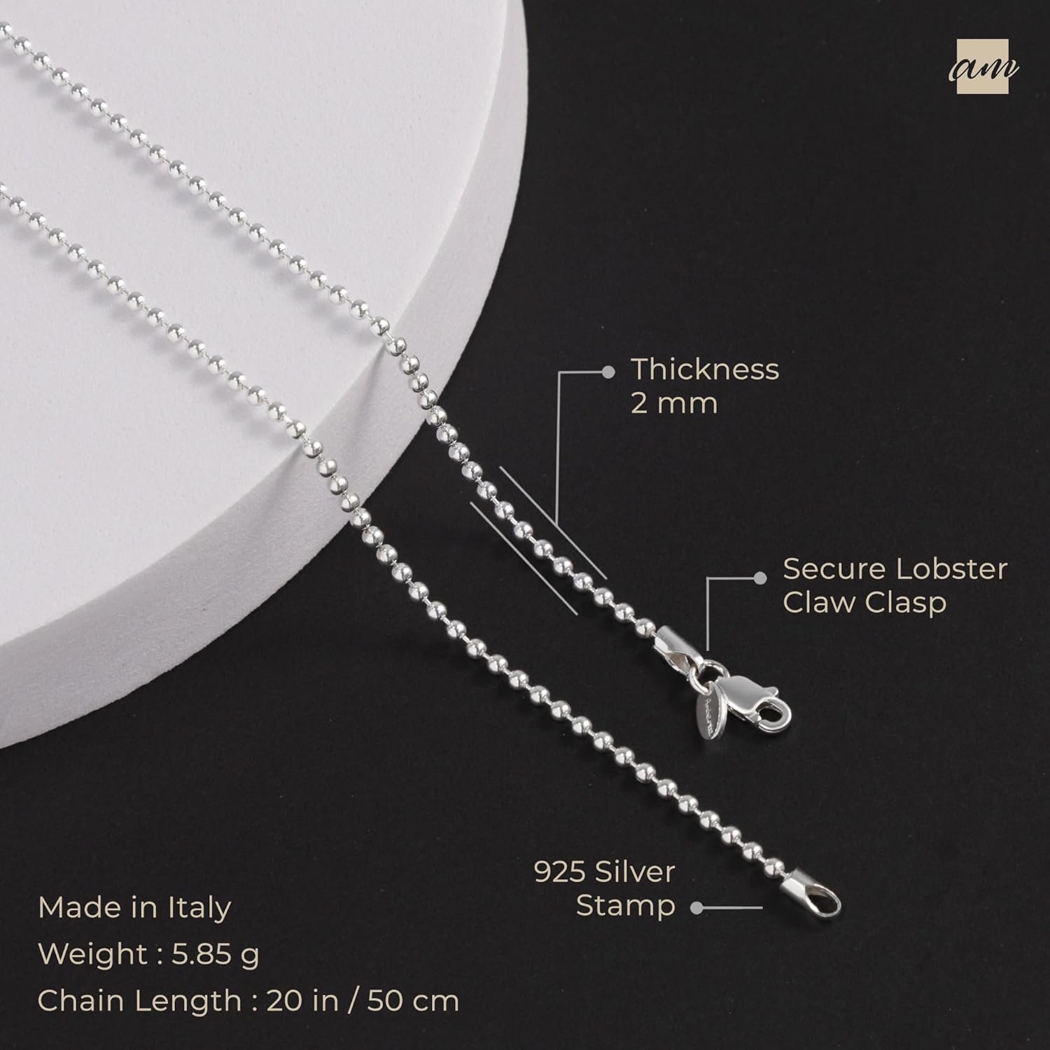 Amberta 925 Sterling Silver 2 mm Ball Chain Necklace Various Styles