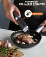 CONVENIENT ONE-HANDED OPERATION – The gravity pepper grinder is gravity activated. Just simply turn upside down and get fresh ground salt or pepper till your heart is content. No buttons or twisting! The white LED light will turn on automatically when the grinder is in operation. *Each Mill requires 6xAAA batteries (not included). Peppercorns or salt not included.