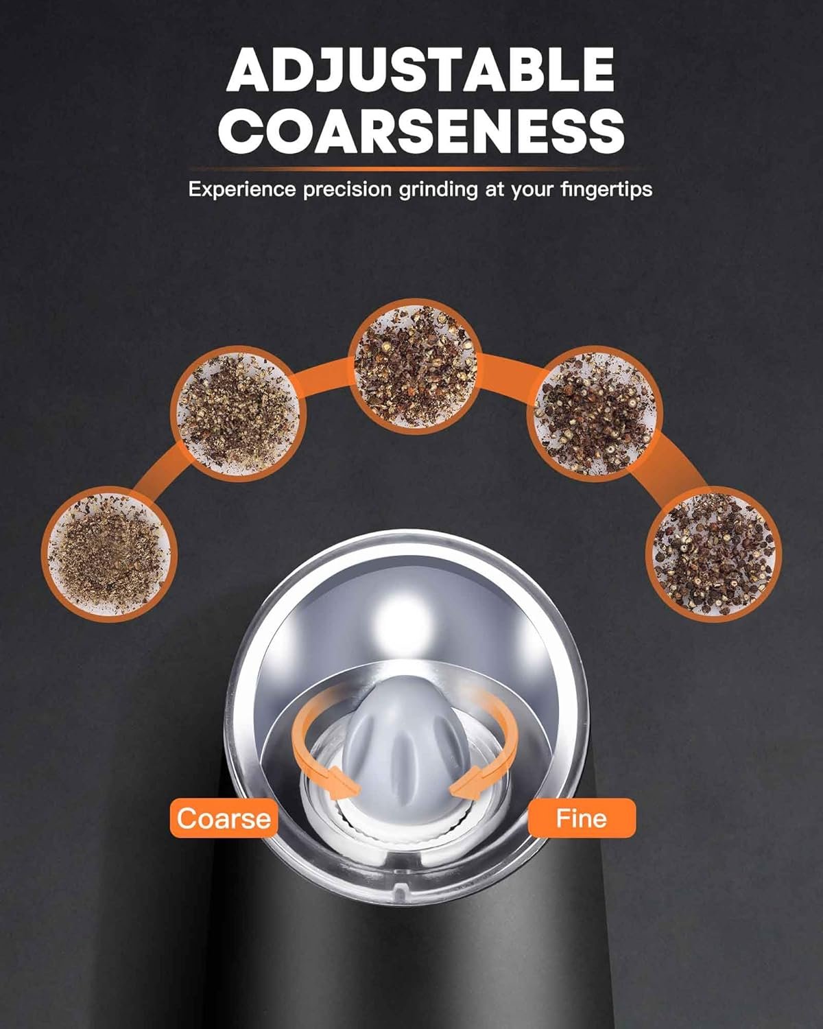 AmuseWit Gravity Electric Salt and Pepper Grinder Set of 2 [White Light] Battery Operated Automatic Pepper and Salt Mills with Light,Adjustable Coarseness,One Handed Operation,Black