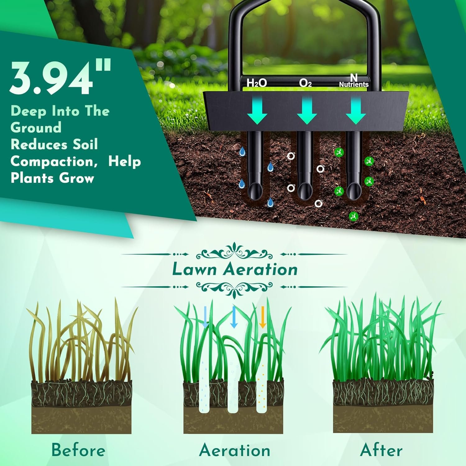 Excellent Aeration Helpmate:The lawn aerator will loosen soil and reduce soil compaction, allowing oxygen, water, nutrients penetrate into plant roots effectively and help plants grow better. It’s a good helper for lawn, yard, garden aeration, which will bring them back to fresh life.