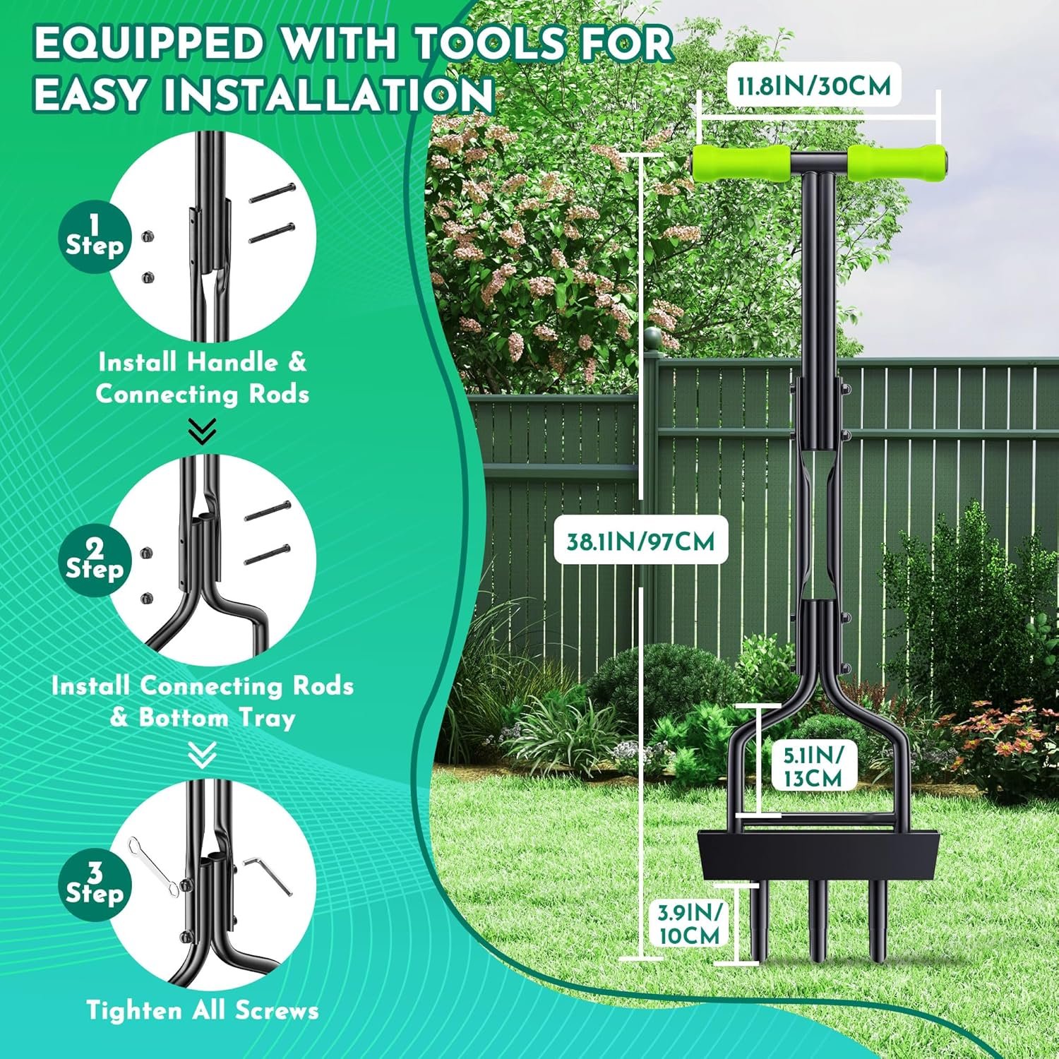 This lawn aerator is designed with a unique soil collection tray that effectively stores coring soil, allowing you to keep your lawn clean and tidy after aeration, eliminating the annoying task of cleaning a dirty lawn!The polished pointed teeth are sharper and can effectively penetrate compacted soil.Heavy-duty craftsmanship saves you more physical effort when aerating, and this lawn aeration tool is perfect for aeration of small lawn areas!The 38’’ lawn coring aerator tool allow you to care for your lawn without back strain & leg pain!