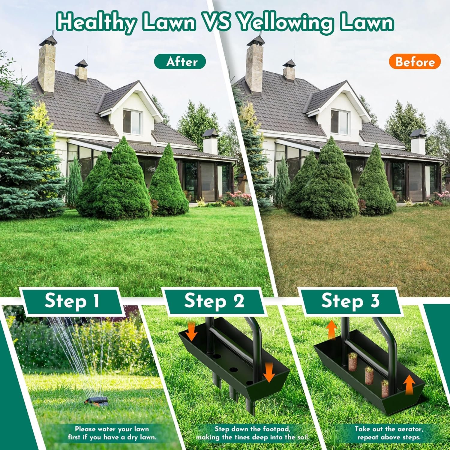 Kindly Reminder: For hard and dry soil, please water the lawn to make it more easier to drive the aerator down and maximize the aerating tool’s performance. The lawn aerator set will help you to take better care of your lawn.