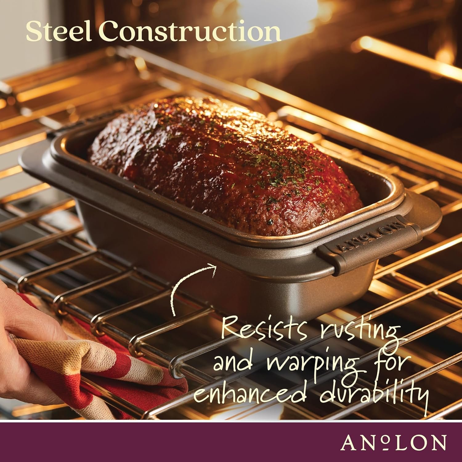DURABLE CONSTRUCTION: This loaf pan’s wide rim and rubberized handles provide solid grip and a comfortable grasp