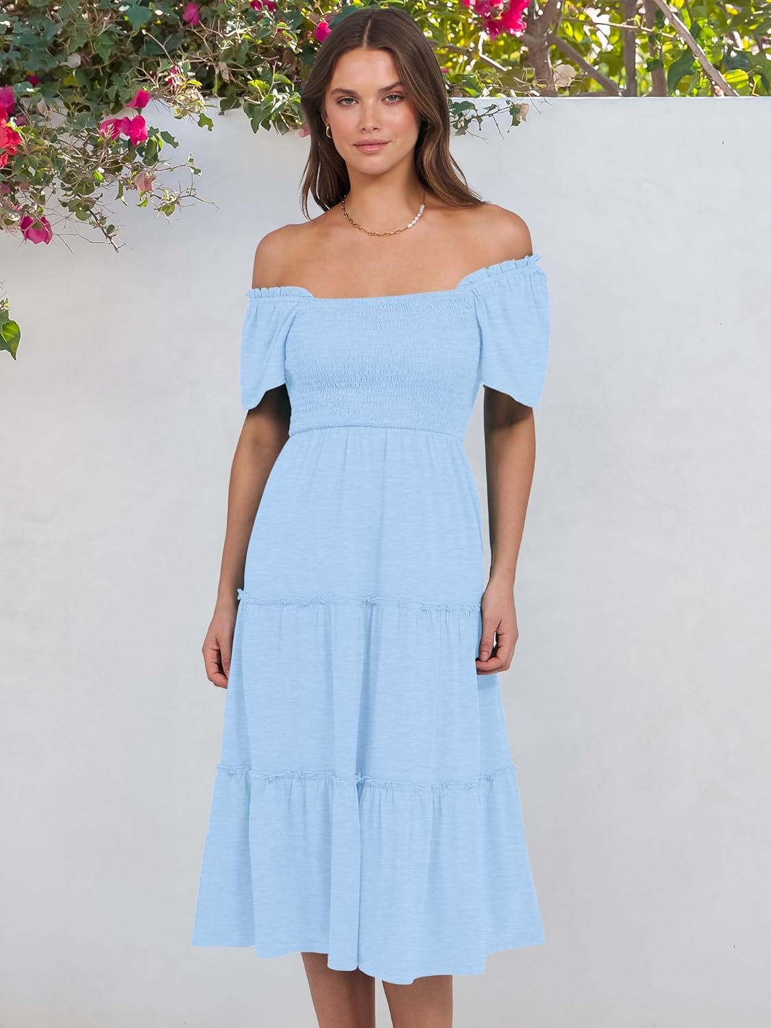ANRABESS Women Summer Casual Square Neck Flutter Sleeve Boho Smocked A-Line Flowy Tiered Modest Midi Sun Dress with Pockets