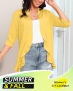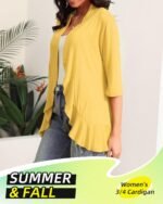 Customers find the cardigan stylish, with the ruffle at the bottom making it flattering, and appreciate its 3/4 sleeve length and perfect fit. The lightweight design makes it ideal for summer wear, and they like its soft, easy-to-wear fabric. However, the material quality receives mixed reviews, with some praising it while others find it poor. Additionally, customers report issues with wrinkles that are difficult to remove, and the material is described as thin.