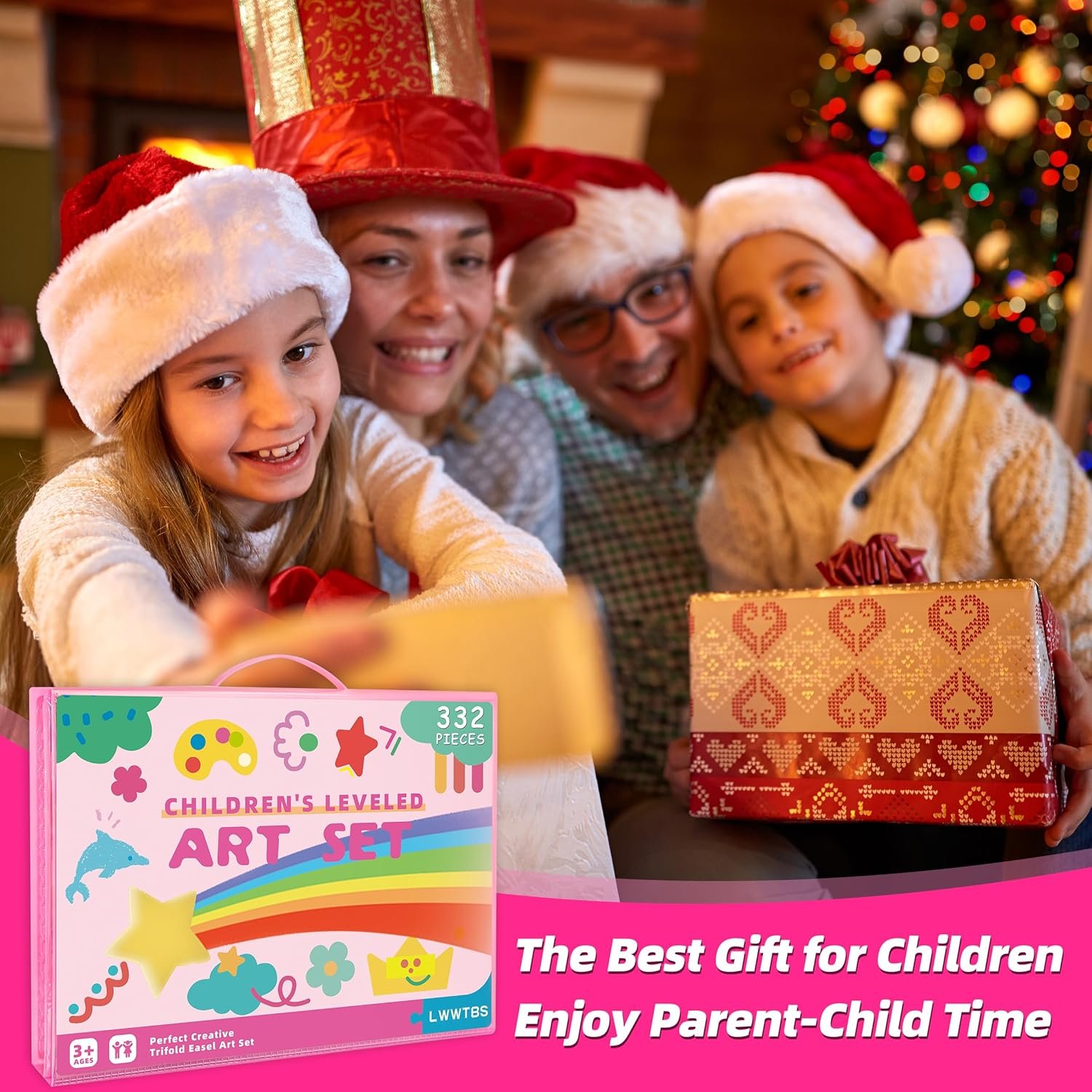 Art Supplies 332 Piece Drawing Art Kit Gifts for Girls Boys Kids Teens Gifts Art Set Case with Double Sided Trifold Easel, Stickers, Sketch Paper, Coloring Book, Pastels, Crayons, Pencils (Pink)