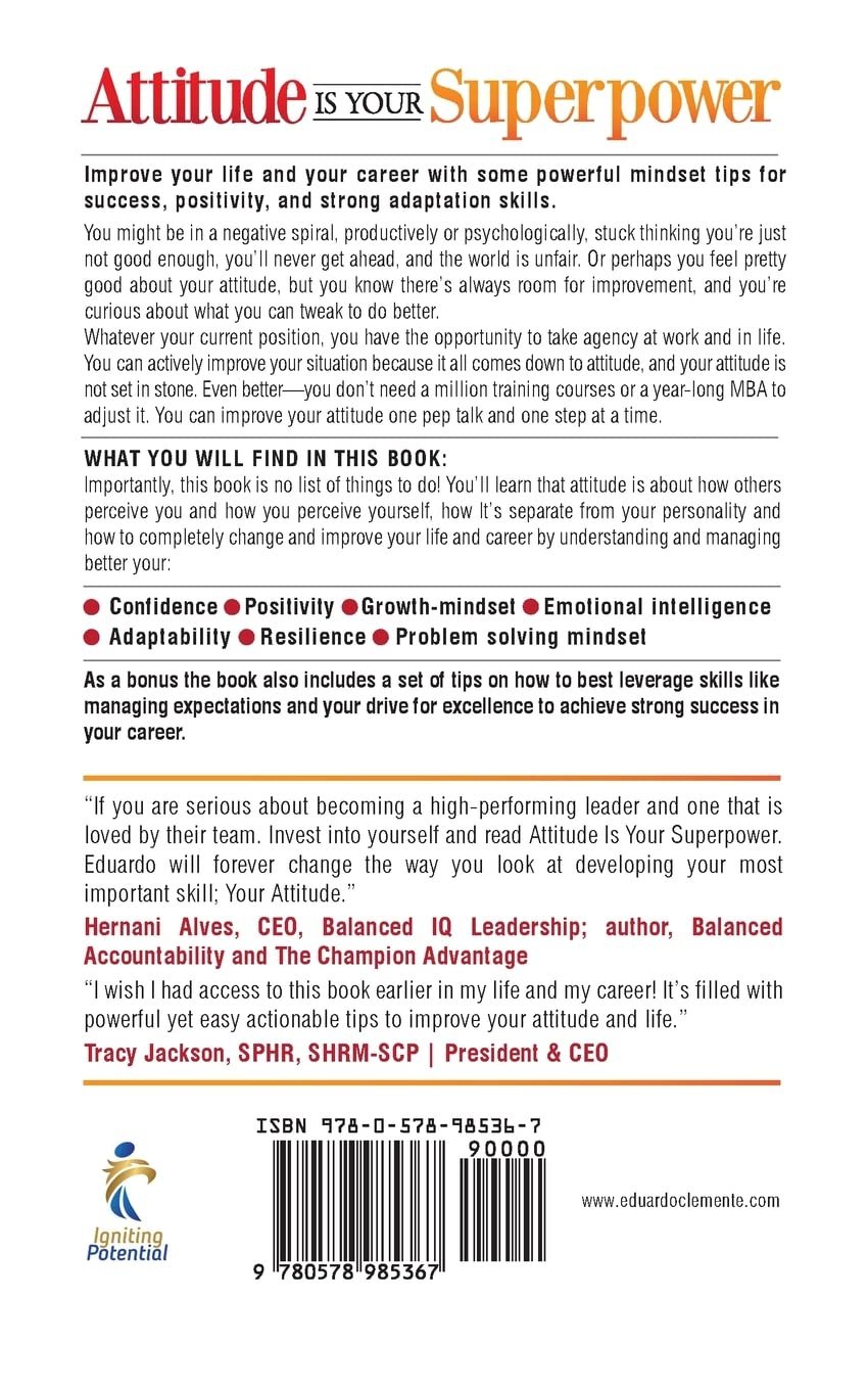 Importantly, this book is no list of things to do! You’ll learn that attitude is about how others perceive you and how you perceive yourself, how It’s separate from your personality and how to completely change and improve your life and career by understanding and managing better your: