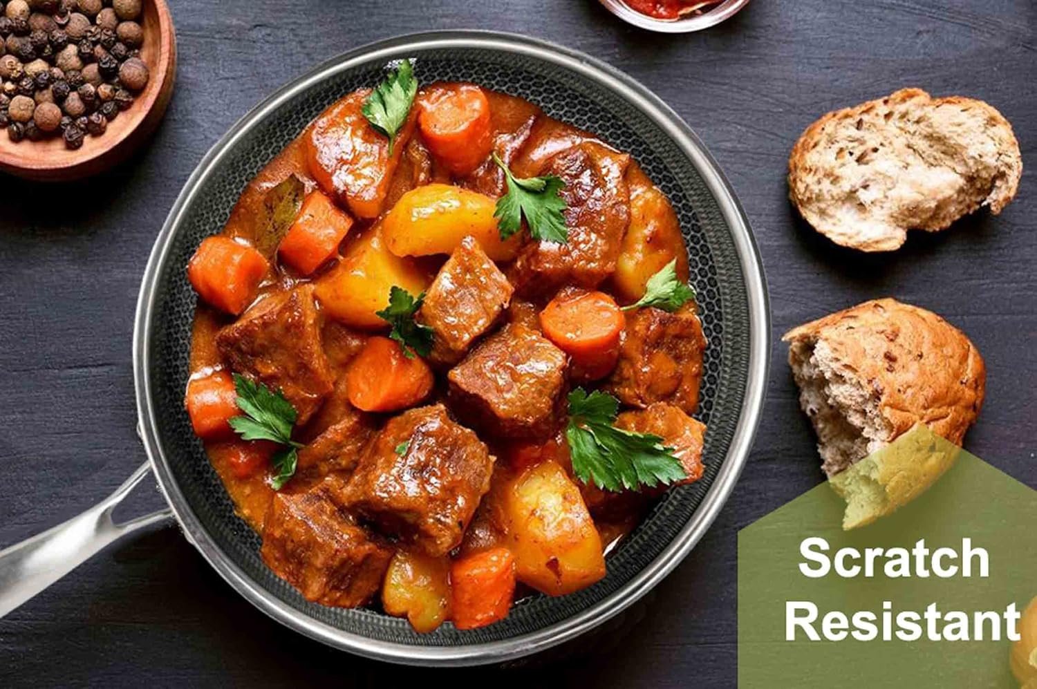 【 Non-toxic 】: The AUDANNE honeycomb wok is made of high-quality stainless steel. This wok is non-toxic and free from harmful chemicals such as PFA and PFOA, making it a safe and healthy choice for you and your family. The honeycomb design ensures that reducing the need for oil, and making clean-up a breeze.Ha