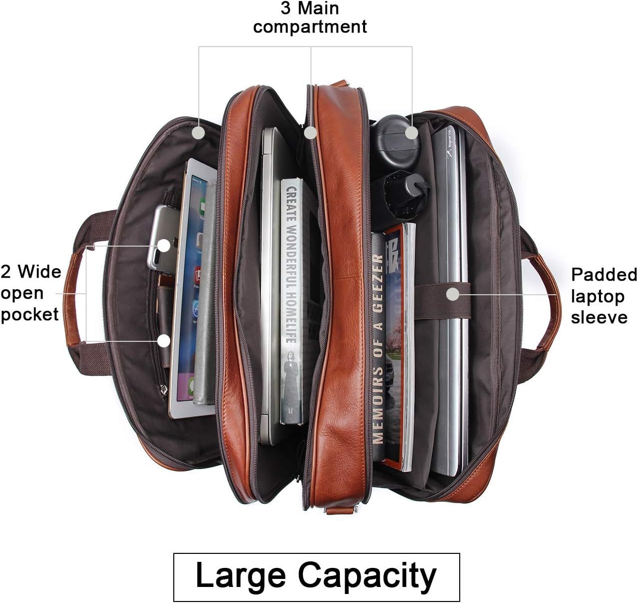 Customers find the briefcase well-made with thick, durable leather and appreciate its spacious design with multiple compartments, including four in the front. The bag receives positive feedback for its distressed leather look, ease of travel, and value for money. However, the functionality receives mixed reviews, with some finding it practical while others report it becoming unusable. Moreover, the zipper quality is a concern, with multiple customers reporting issues with zippers breaking and falling off.