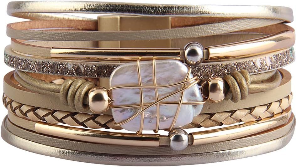AZORA Womens Leather Cuff Bracelet Baroque Pearl Wrap Bracelets Gorgeous Gold Tube Bangle Handmade Wristbands Jewelry Bohemian Gift for Women