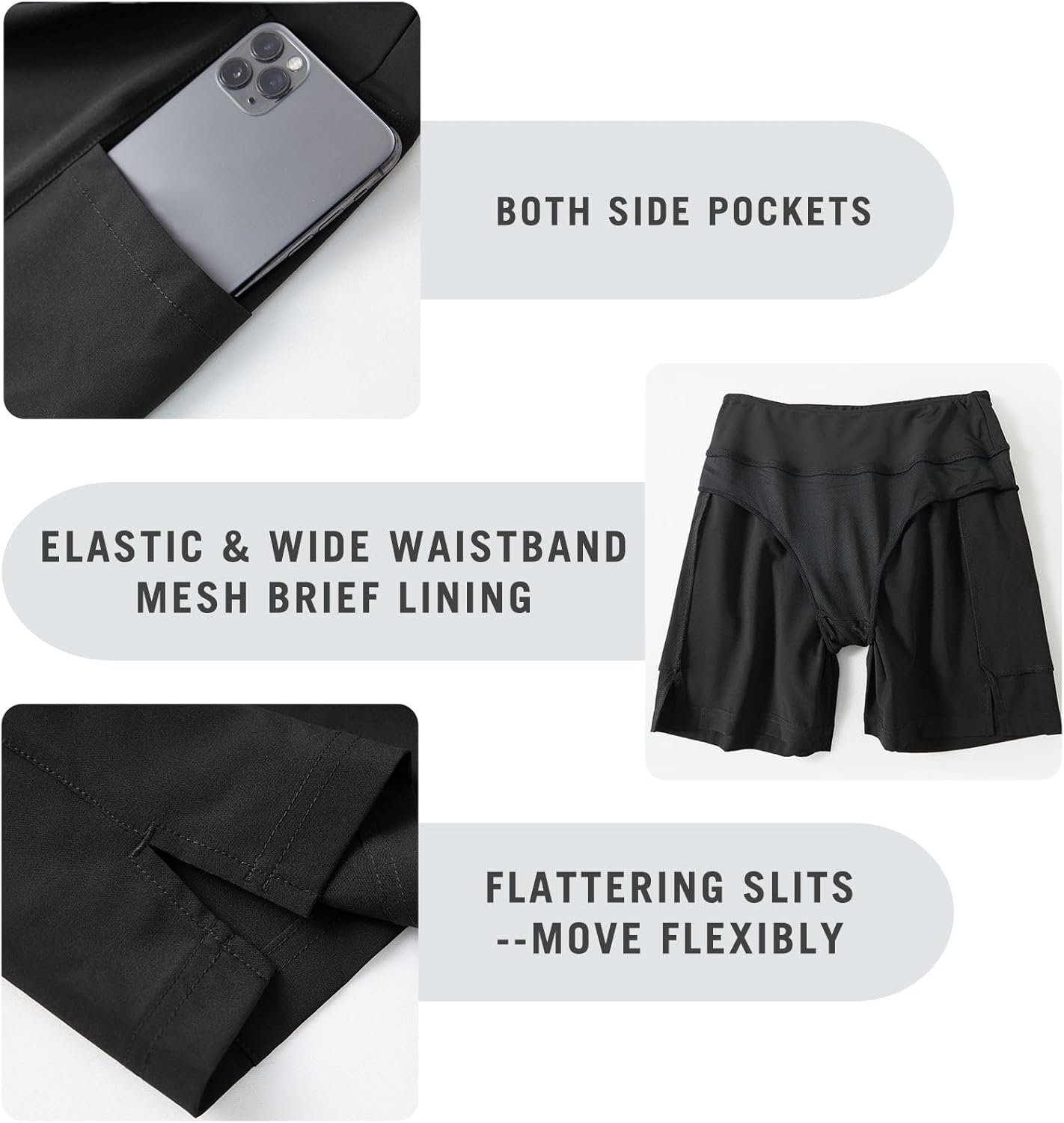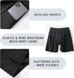 Customers find these swim shorts comfortable and true to size, with a flattering high waistband and rich navy color. The shorts are made of breathable material that holds up well to chlorine and dries quickly, featuring zippered pockets that are particularly useful for walking. They appreciate the quality, with one customer noting the built-in underwear feature, while another mentions the perfect inseam length for swim shorts.