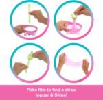 Unscrew the animal ear lid with the shimmery Slime and use the straw to poke through the film to discover squishy fun!