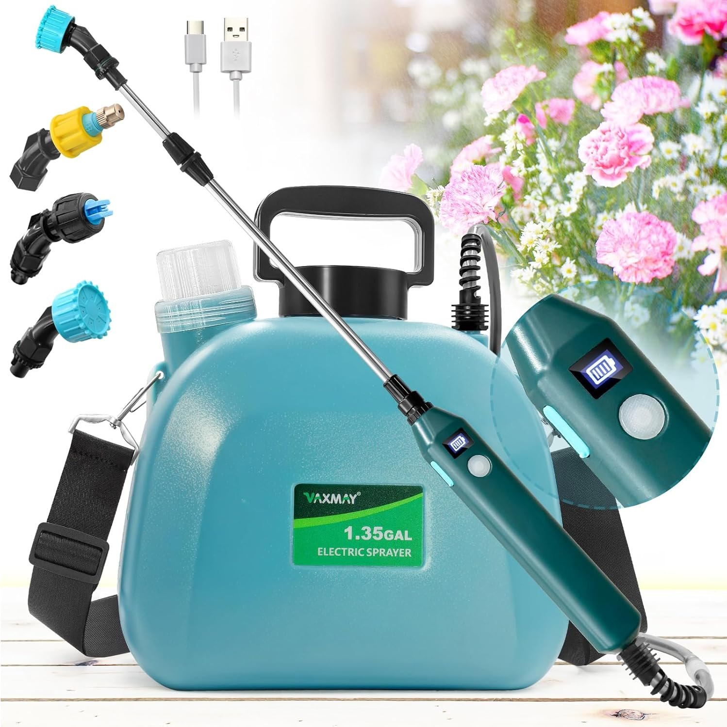 Battery Powered Sprayer 1.35 Gallon, Upgrade Electric Garden Sprayer with Battery Indicator, 3 Mist Nozzles, USB Rechargeable Handle with 23.6″ Retractable Wand Adjustable Shoulder Strap for Weed Lawn