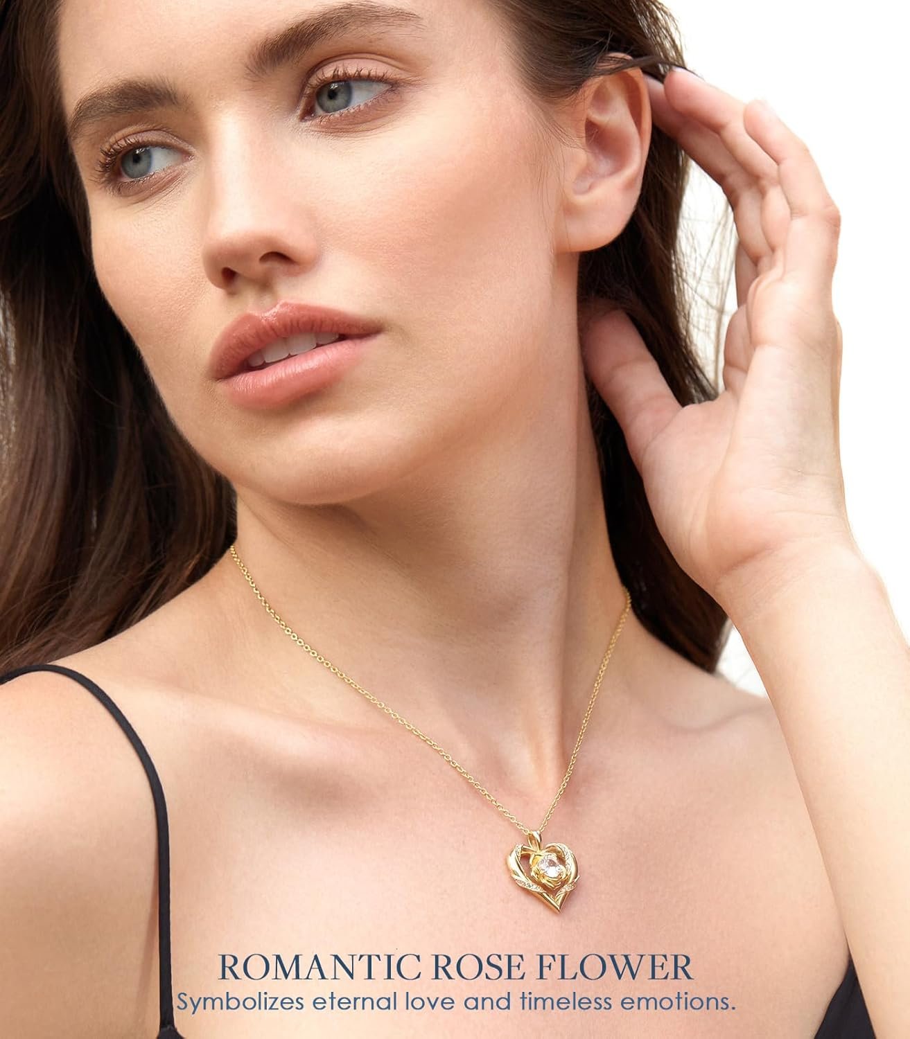 The stunning design features a heart pendant with a delicate rose motif, symbolizing infinite love and the strongest bond.