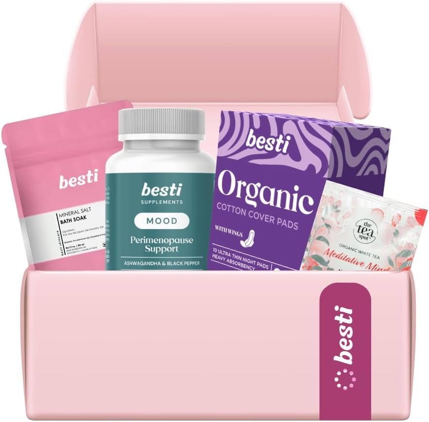 Besti PMS Relief Kit: Organic Tea, Night Pads, Mood Supplement & Soothing Bath Salts for Natural Hormone Balance & Stress Reduction