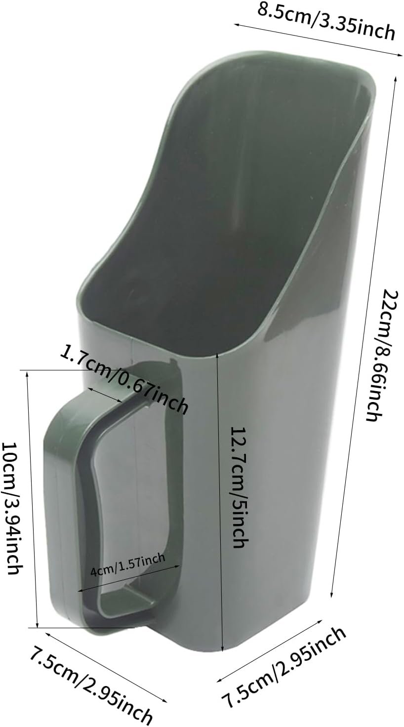 Package including 1 pc x shovel,Size is about 7.5×7.5x22cm/2.95×2.95×8.66inch,Color is army green. Soil Scoops are made of durable plastic and very easy to clean, just rinse off.