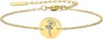 Birth Flower Bracelet 18k Gold Engraved Custom Floral Pendant Bracelets Dainty Stainless Steel Birth Month Chain Disc Charm Hand Stamped Flower Disk Bracelets Personalized Jewelry Birthday Gift for Her