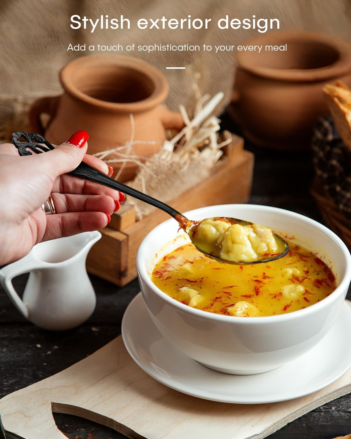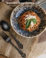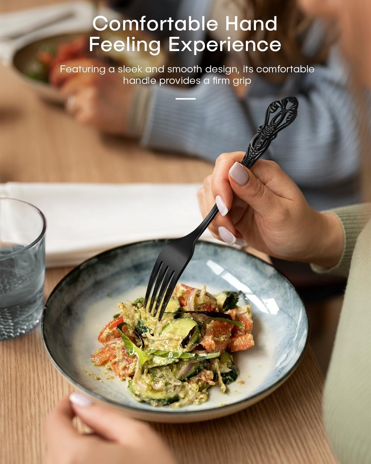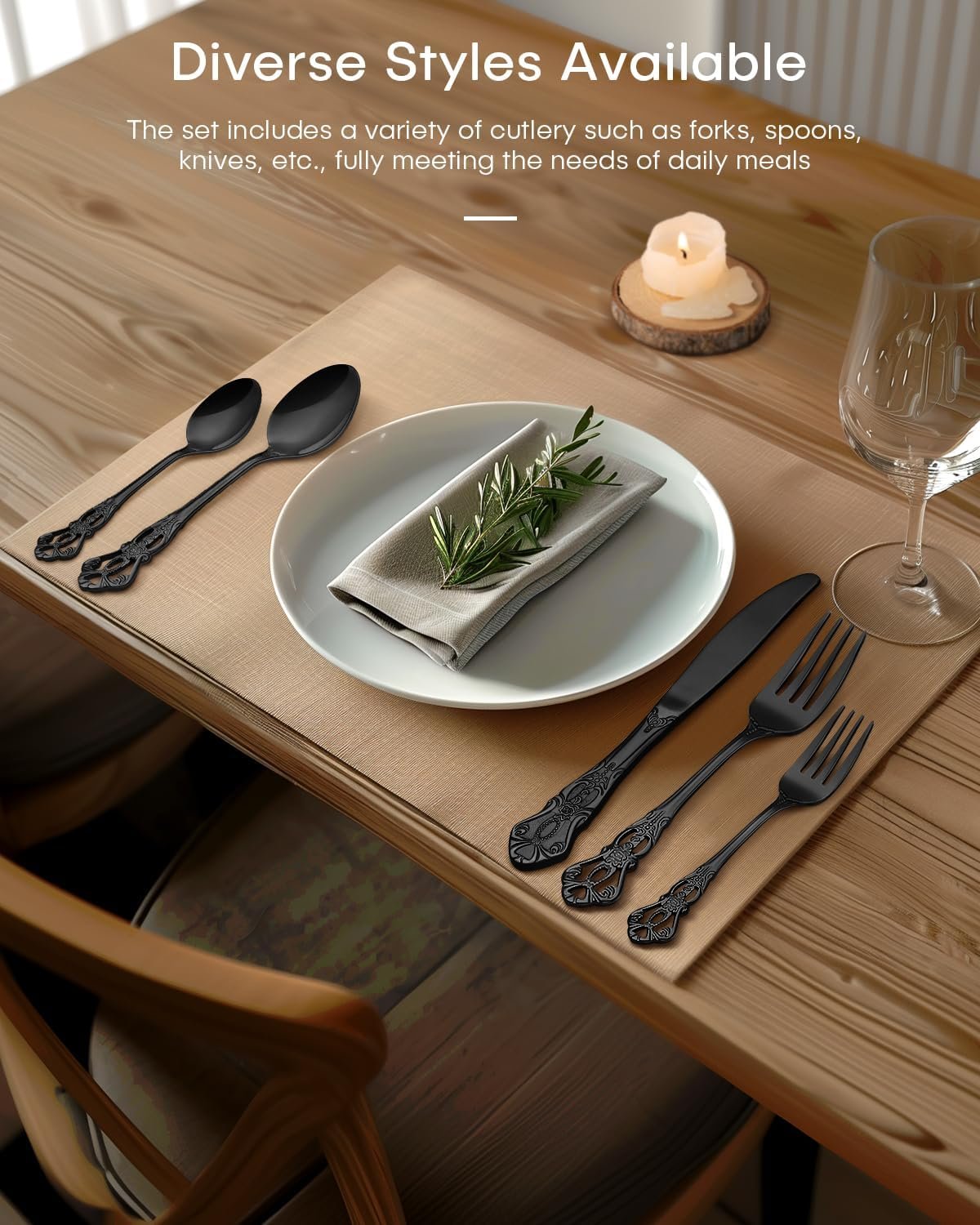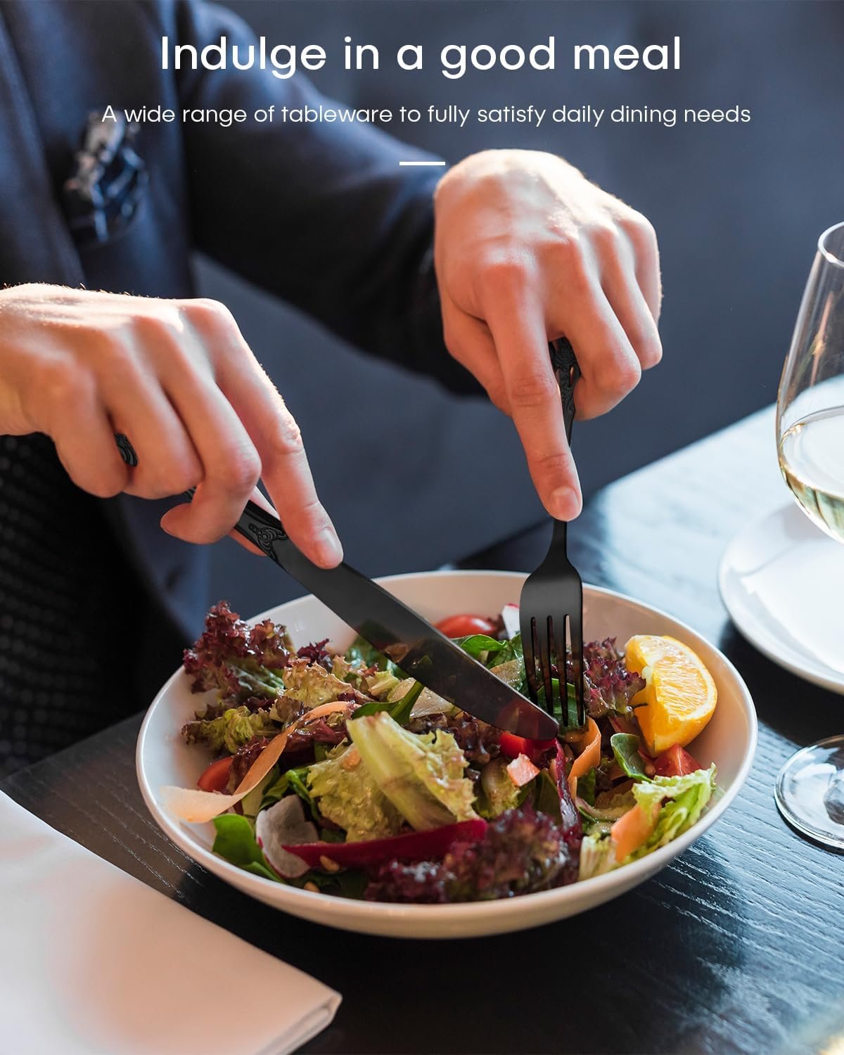 Proper Weight&Ergonomic Handle:Unlike others, our utensil handles design according to the natural posture of hand for max comfort during use without cause fatigue.Black Tableware Set smooth edges ensure safety,no scratches,easy to clean,dishwasher safe!