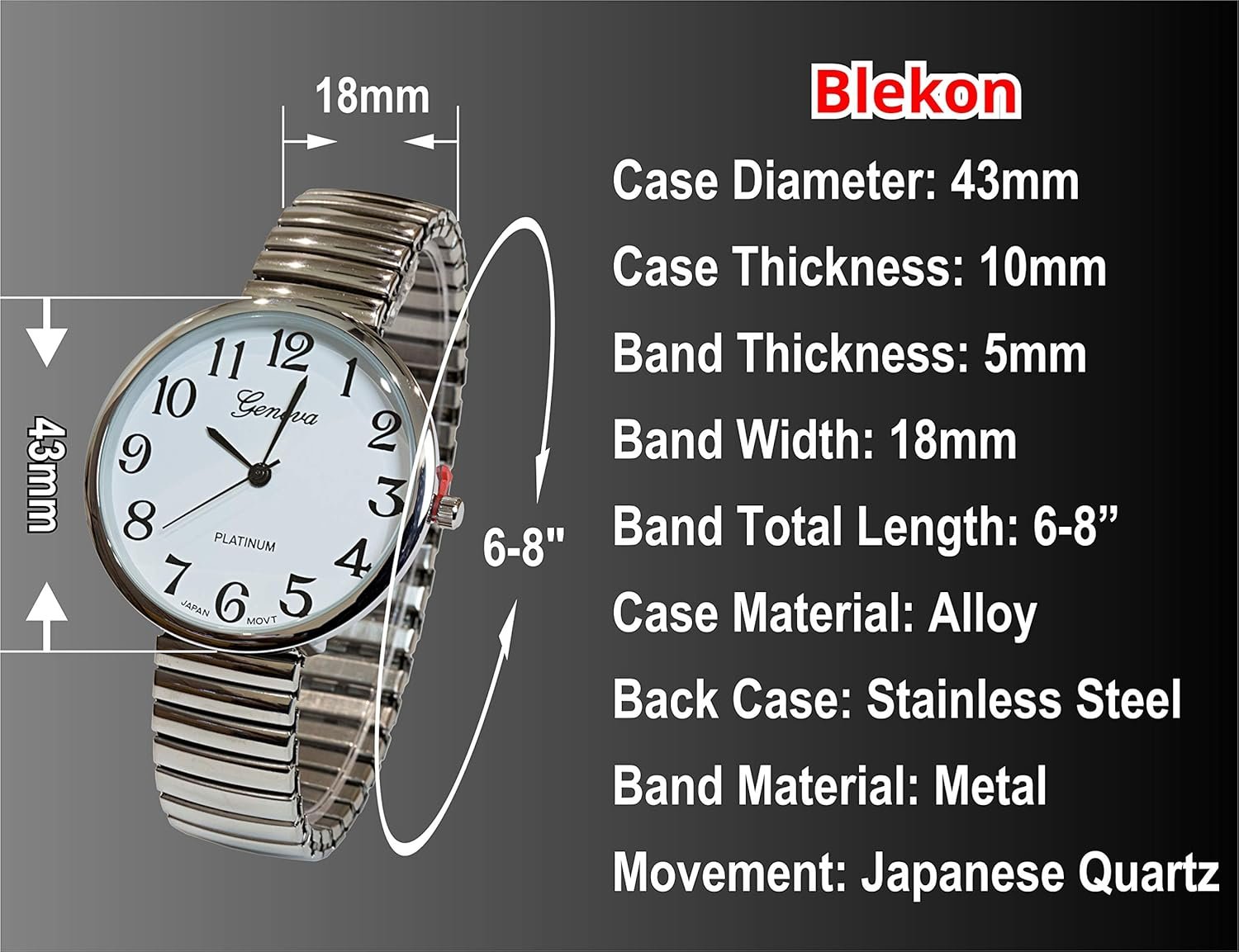 Beautiful large size Silver stretch band watch, slim band design case, easy to wear stretch band that will fit all wrists from 6 to 8 inches. Case size is about 1.5 inches in diameter, White dial with Black hands and numerals.