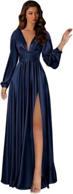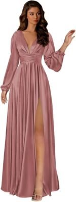 BOLENSYE Satin Bridesmaid Dresses Long Sleeve A Line V Neck Ruched Slit Formal Evening Party Gown with Pockets