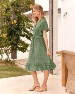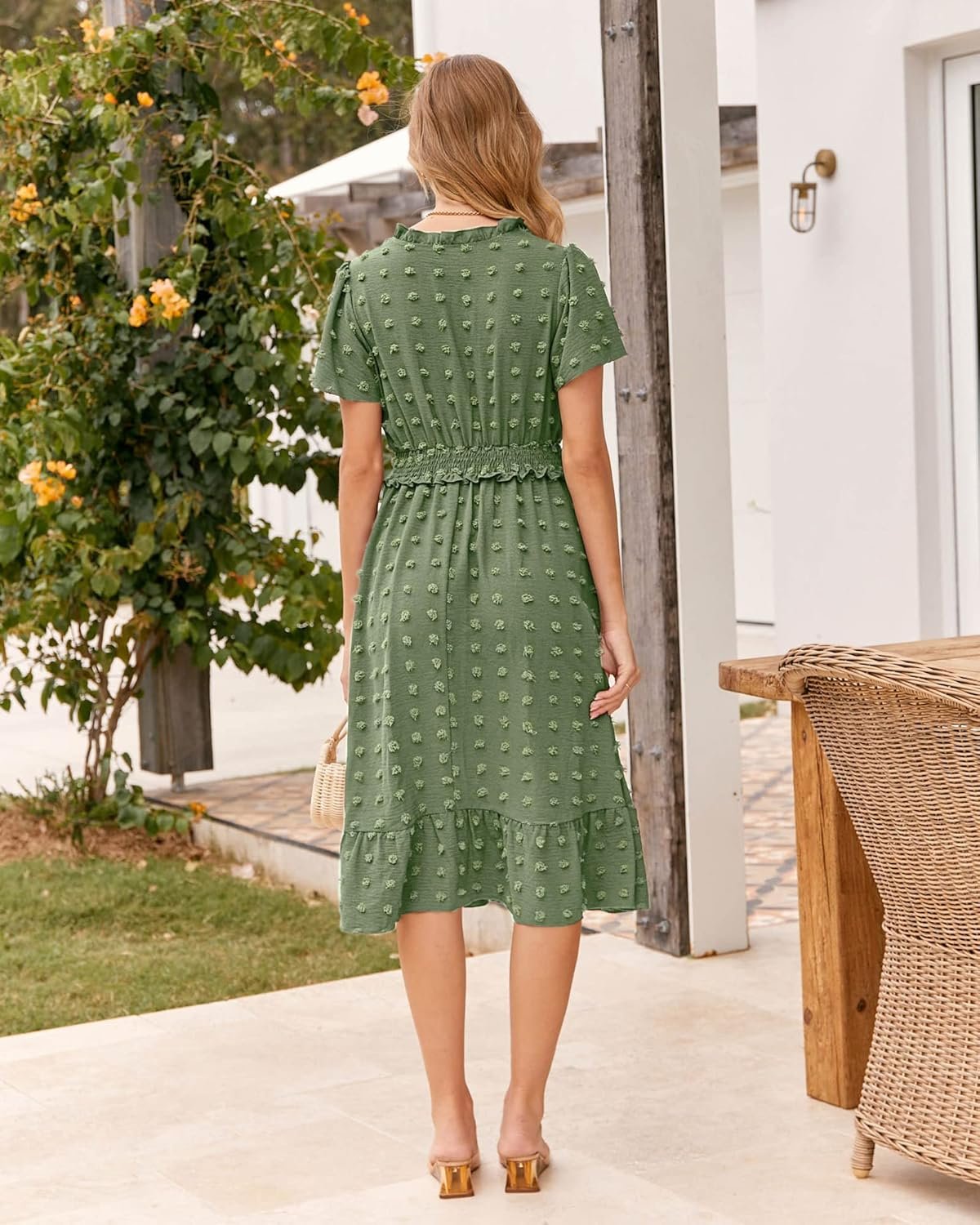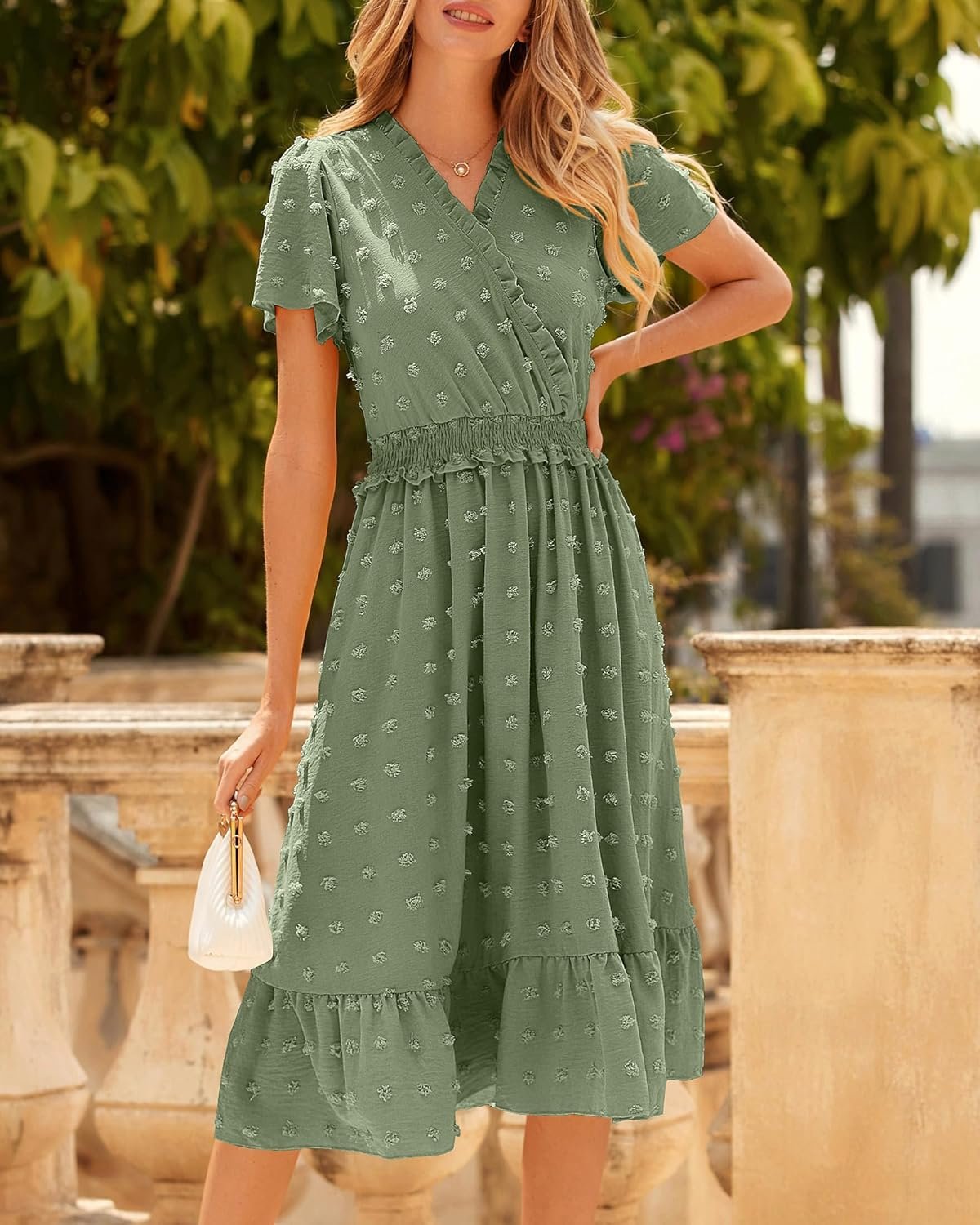 The Semi-Formal Swiss Dots Dress Is Made Of Lightweight And Comfy Chiffon FabricTrimmed With Classic V Neck, Ruffle Details, Flutter Sleeves, Elastic High Waist, Swiss DotsRelaxed Fit And High Waist Make The Swiss Dots Dress Suitable For Most Figures