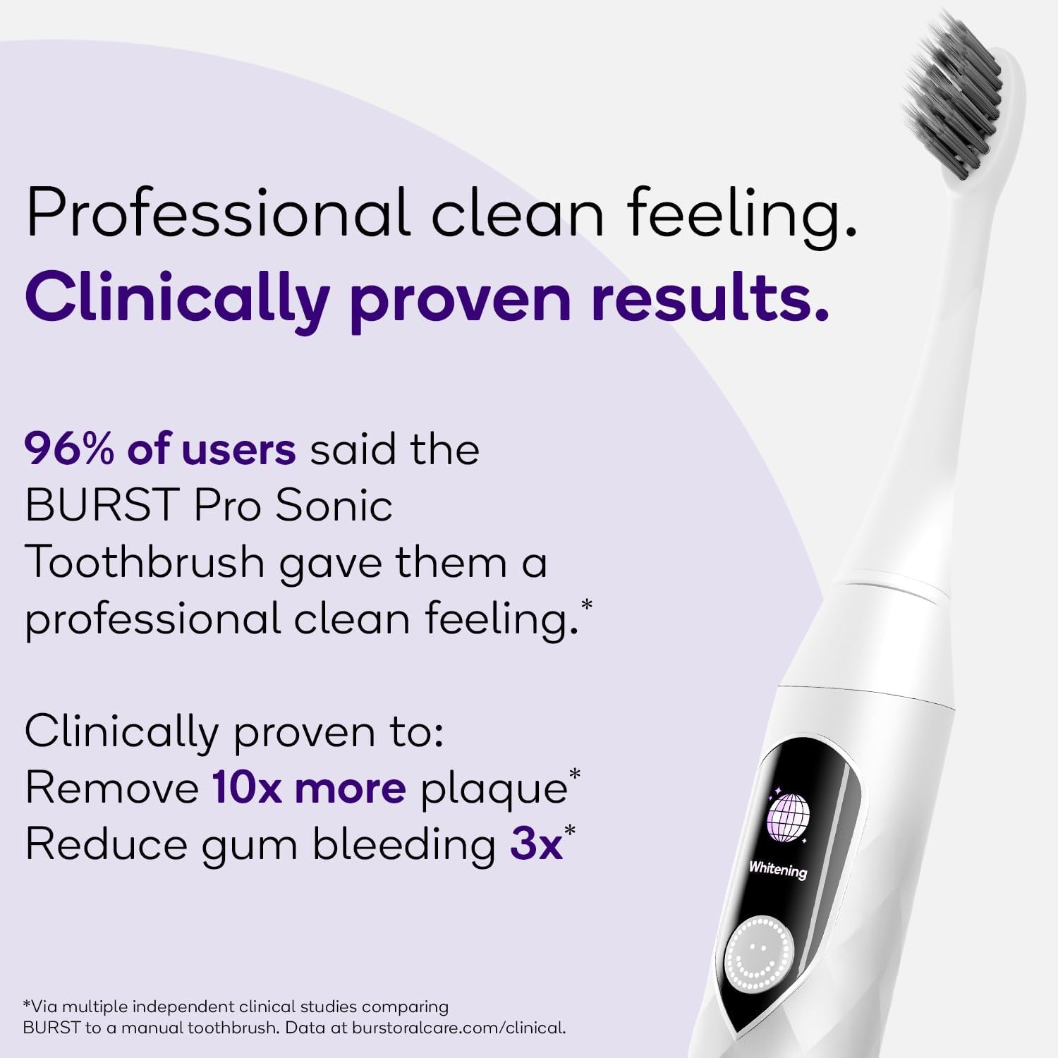 *The BURST Pro Sonic Toothbrush removes up to 10x more plaque, provides healthier gums in 2 weeks, and reduces bleeding gums 3x after 30 days compared to a manual toothbrush as shown in two independent, 30-day single-blind clinical studies of 92 and 97 healthy subjects, respectively, with mild-moderate levels of plaque and gingivitis. The subjects brushed twice daily using a fluoride toothpaste with either a manual toothbrush (control group) or with the BURST Sonic Toothbrush (experimental group). These results were collected in Aug 2019 by Salus Research, Inc. and All Sum Research Center Ltd. in compliance with ICH Good Clinical Practices (GCP) including the archiving of essential documents and compiled in the report “Plaque and Gingivitis Efficacy of a Sonic Toothbrush: Two Thirty-Day Independent Studies” (PTB-001-2019 & PTB-002-2019).