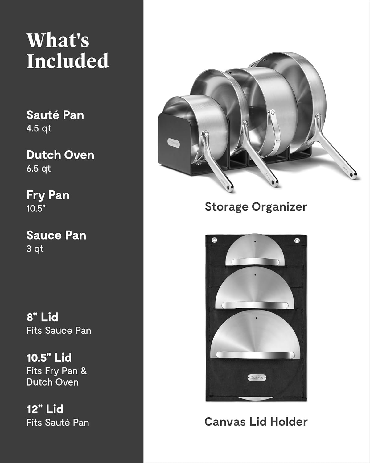 WHAT’S INCLUDED: Caraway’s Stainless Steel Collection – includes a 10.5″ Fry Pan, 3 qt Sauce Pan, 4.5 qt Saute Pan, and a 6.5 qt Dutch Oven. Lids are included for Sauce Pan, Saute Pan, and Dutch Oven. Enjoy the added convenience of complimentary pan and lid storage.
