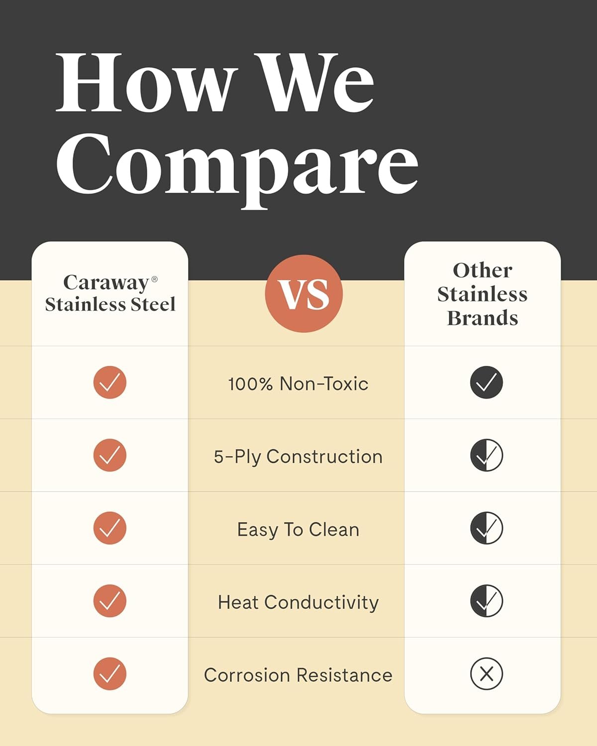 BRINGS THE HEAT: Elevate your culinary experience with Caraway’s 5 ply Stainless Steel Cookware Set designed for optimal heat distribution. Limited lifetime warranty included for a long life of sizzling, searing, and sautéing.
