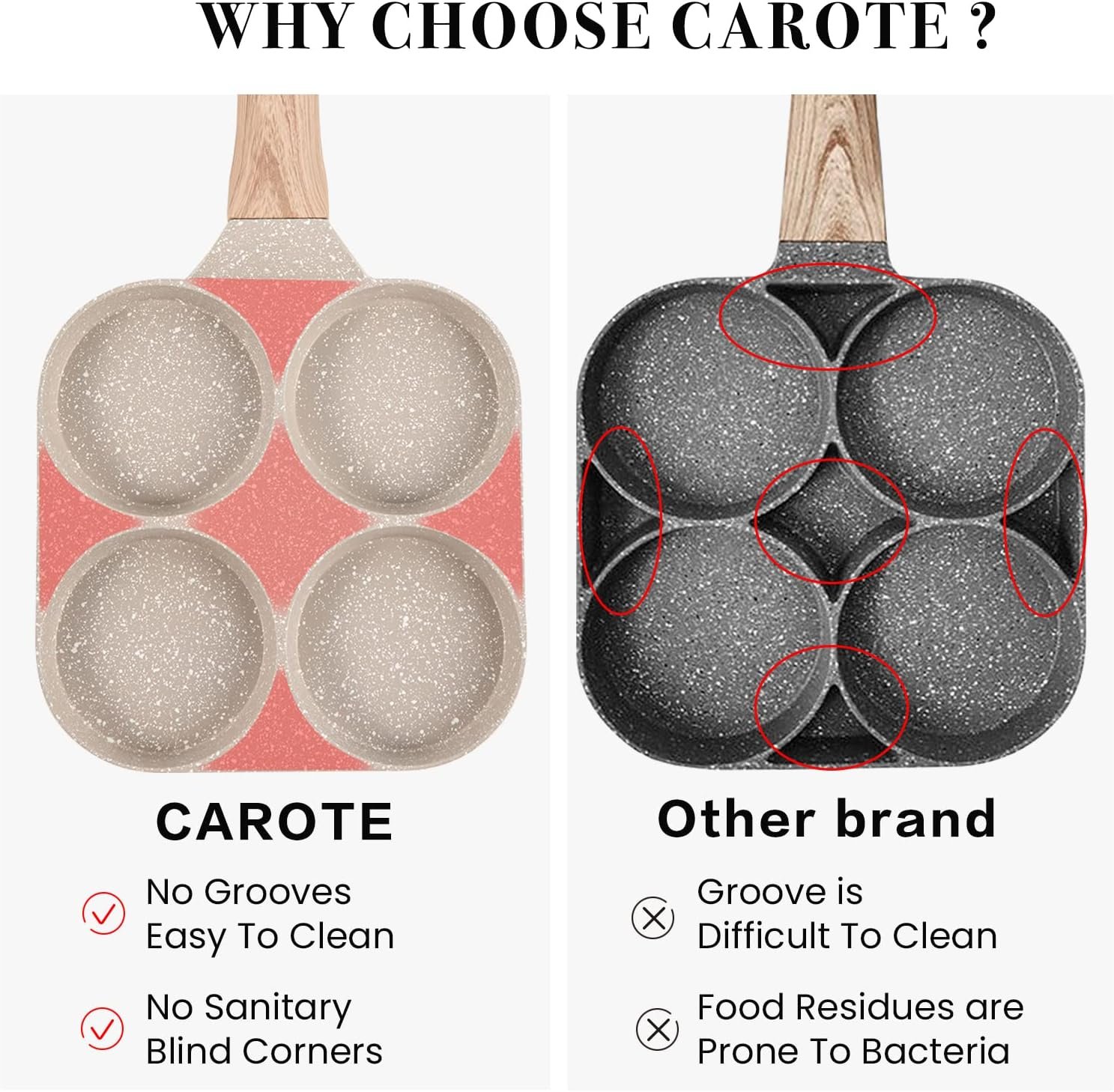 Eco-friendly Granite Non-Stick Material: Carote egg pancake pan with nonstick granite material. With 100% Free of PFOS, PFOA, our 4-Cup egg frying pan ensures your daily cooking is always safer and healthier.