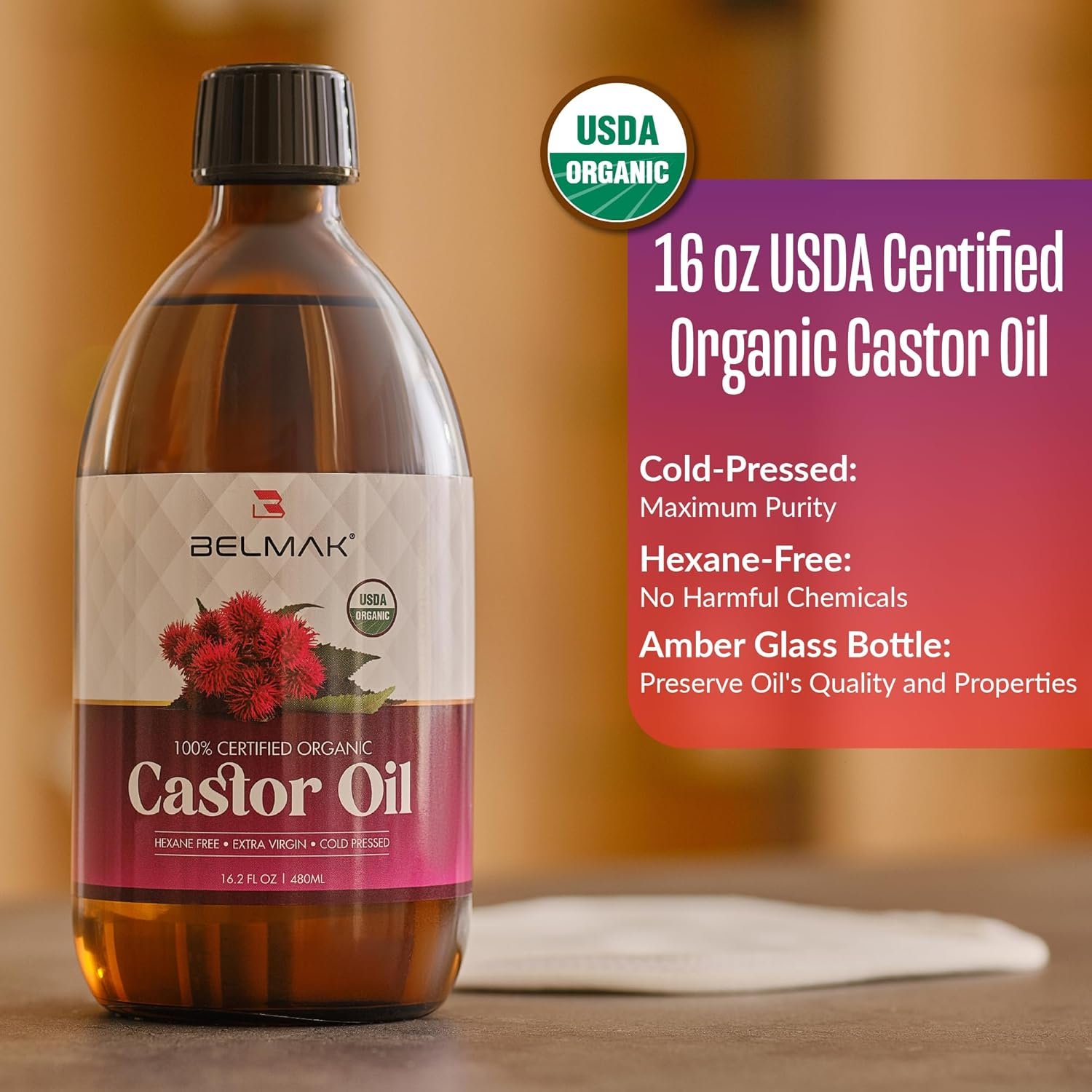 USDA CERTIFIED ORGANIC CASTOR OIL: Our castor oil wrap includes 100% castor oil organic cold-pressed hexane-free glass bottle, guaranteeing superior quality and optimal benefits for your wellness routine.