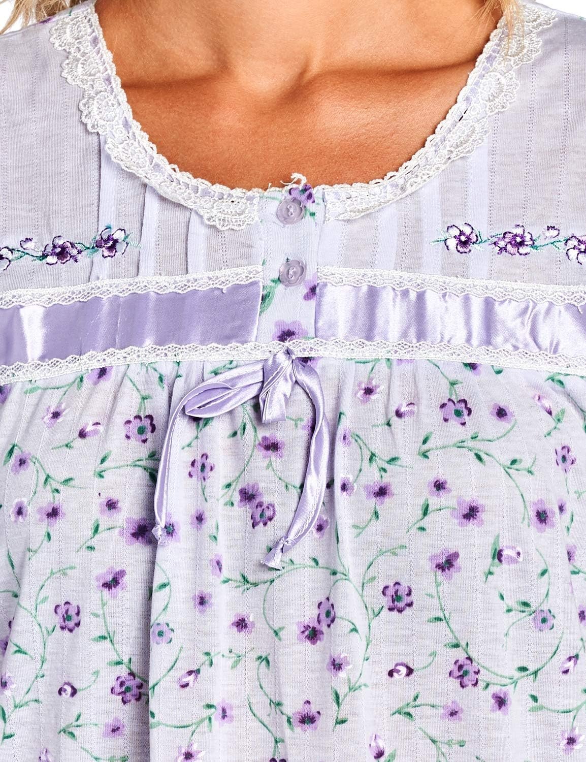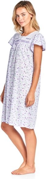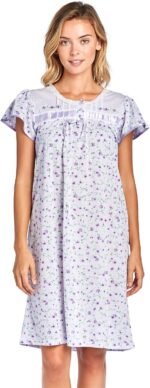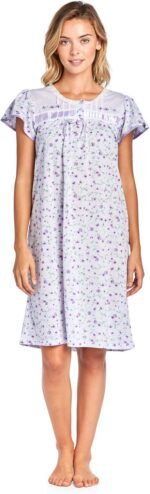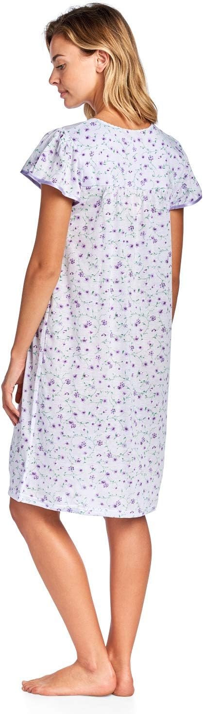 Hit the sack in total comfort with this Soft and lightweight knitted Short Sleeve Nightgown sleepwear from Casual Nights is Soft and lightweight in a feminine floral pattern, Sleep dress Features 2 to 5 Button closure, short cap sleeves, detailed with lace, Satin Ribbon for an extra fancy touch. Gown measures 40” from shoulder to hem. A comfortable fit perfect for sleeping or lounge around as a house-dress. Beautiful enough for special occasions, yet comfortable enough for every day.